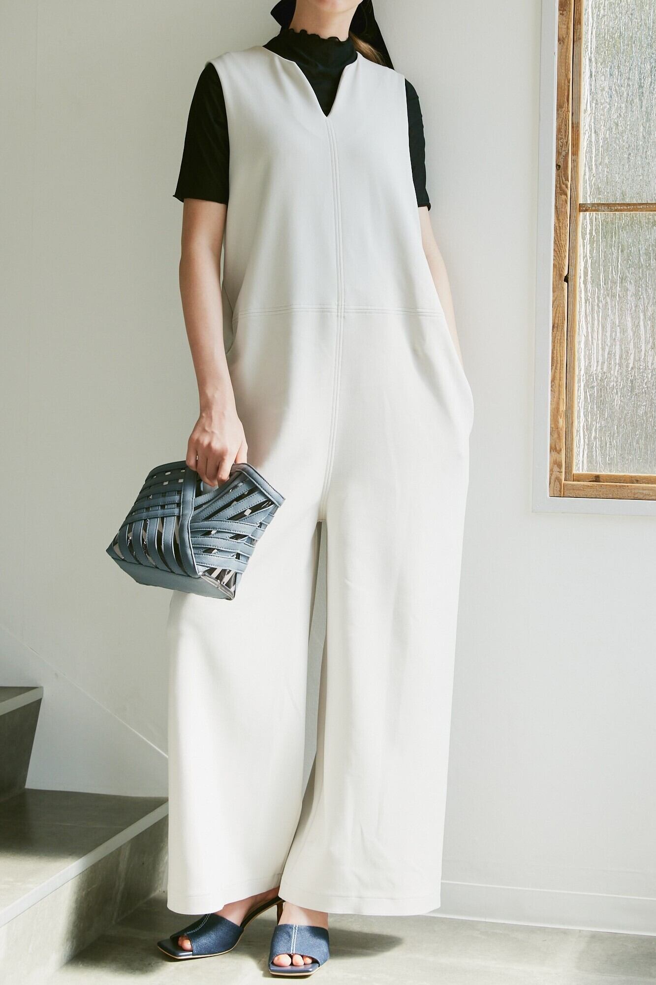身体のラインは響きにくく、シワになりにくくストレッチの効いた素材を使用し、着心地もシルエットも追求したオールインワンです。