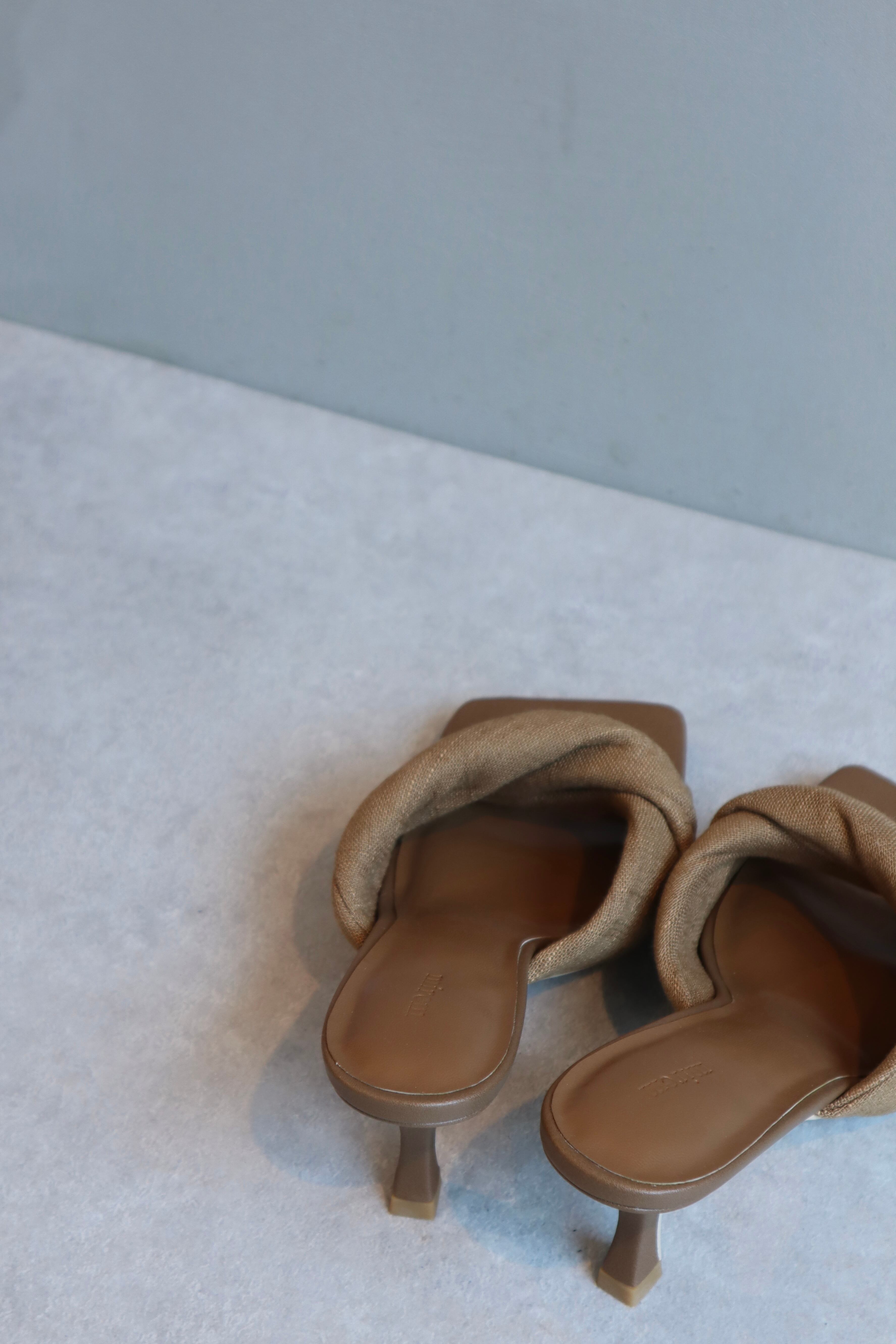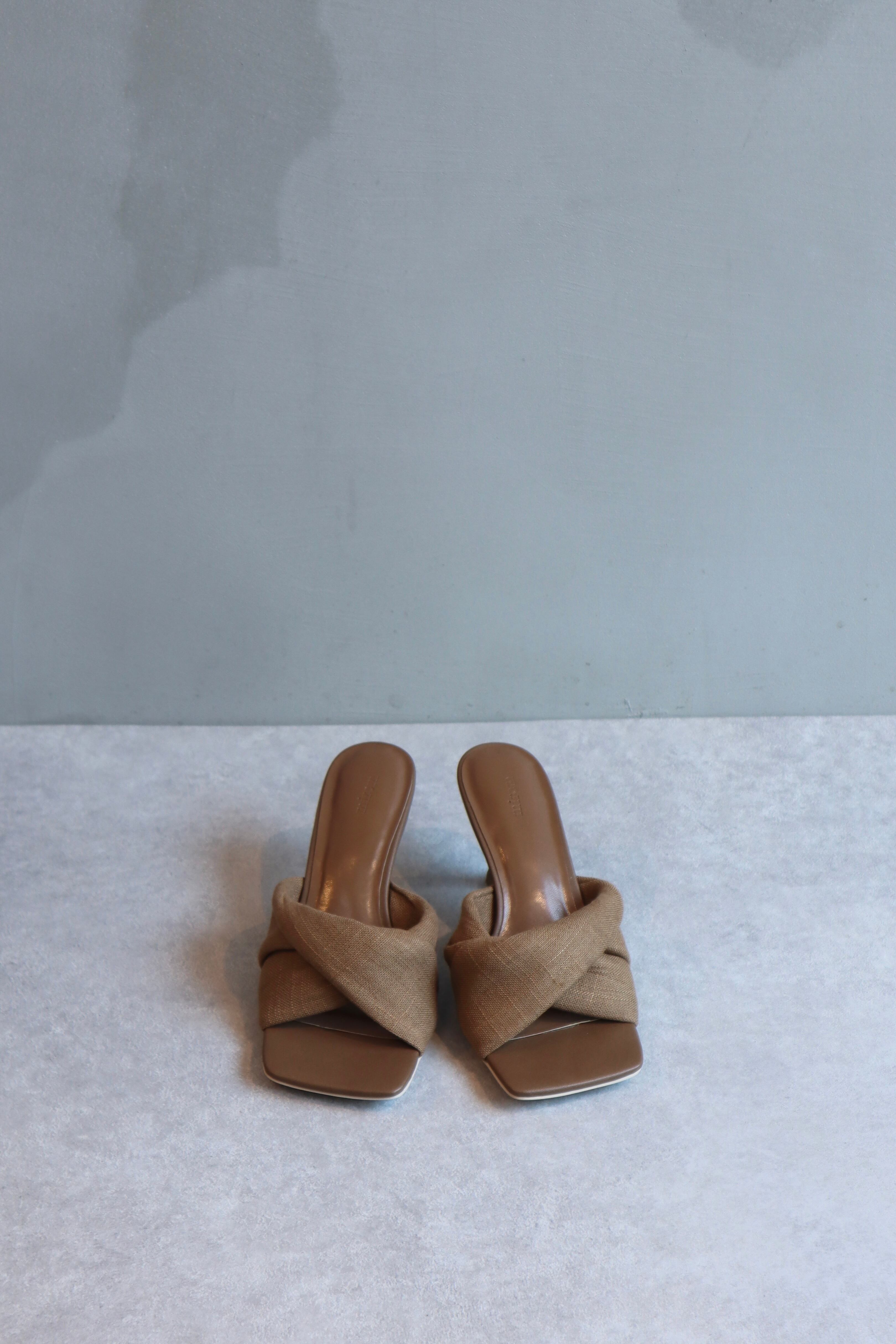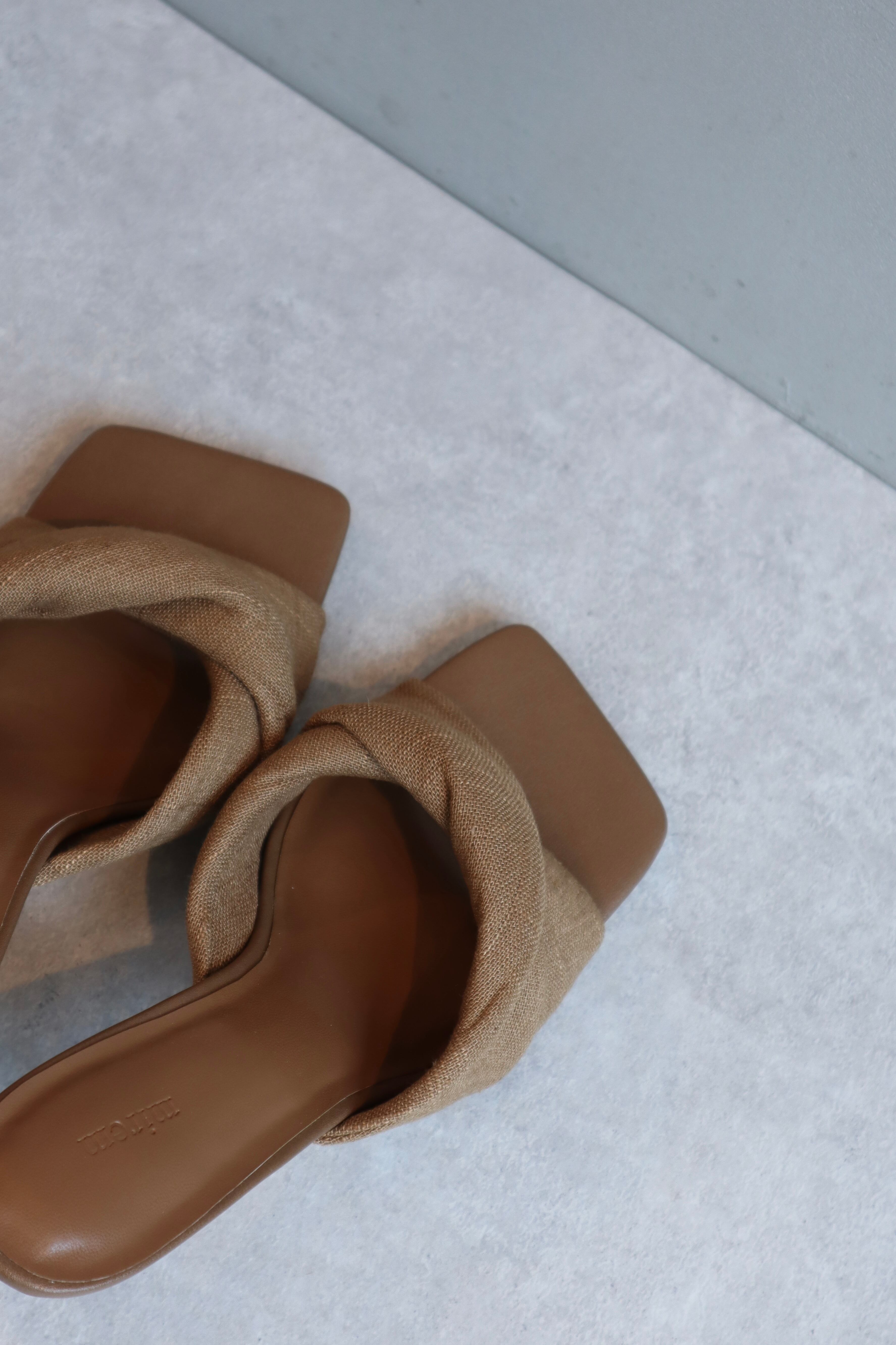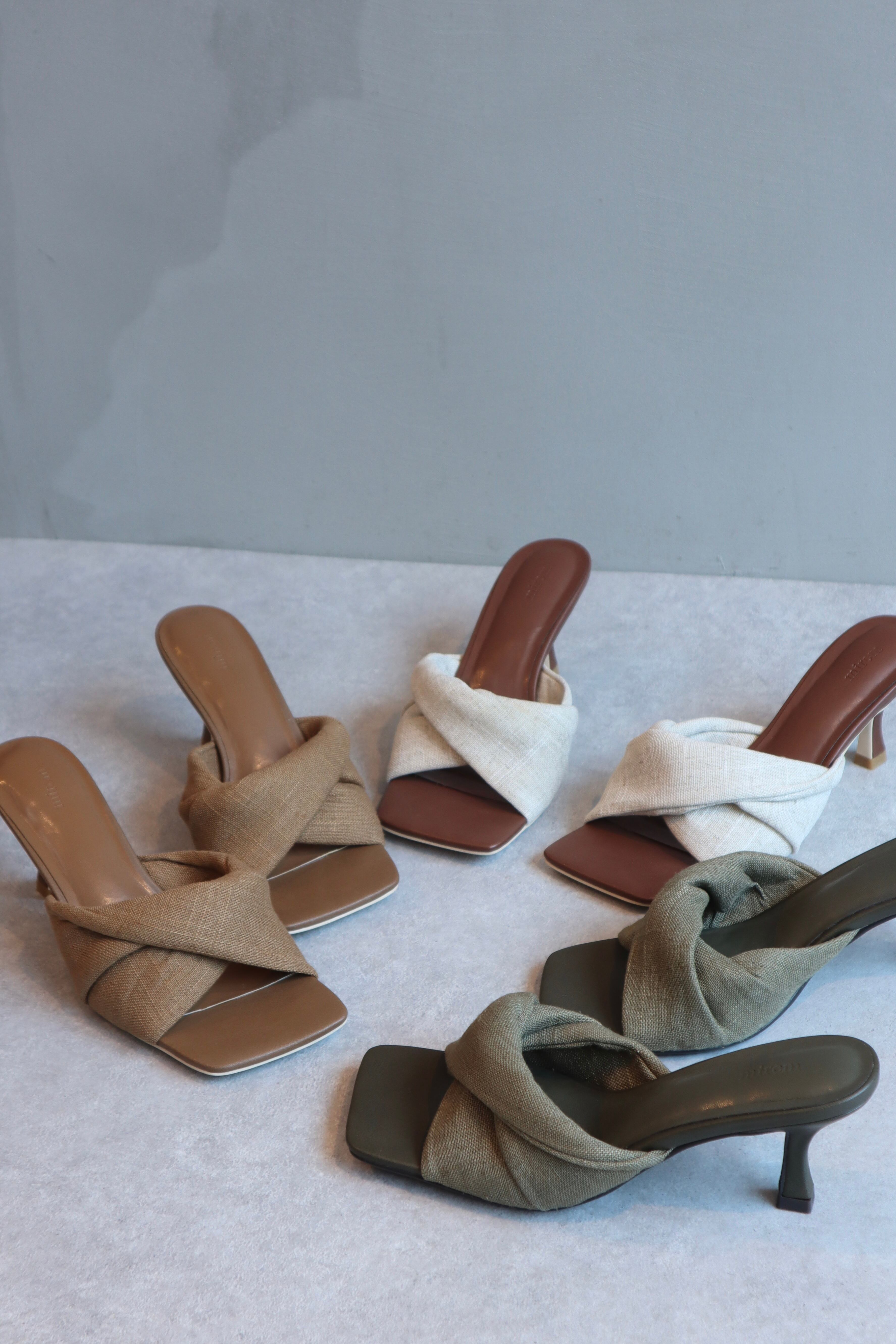 トレンドのひねりデザイン、アッパーにはふかふかなクッションも入っているので、快適な履き心地です。カジュアル素材を使用したこちらのミュールは、抜け感もしっかりとあり、リゾートスタイルにもばっちりなアイテムです。
