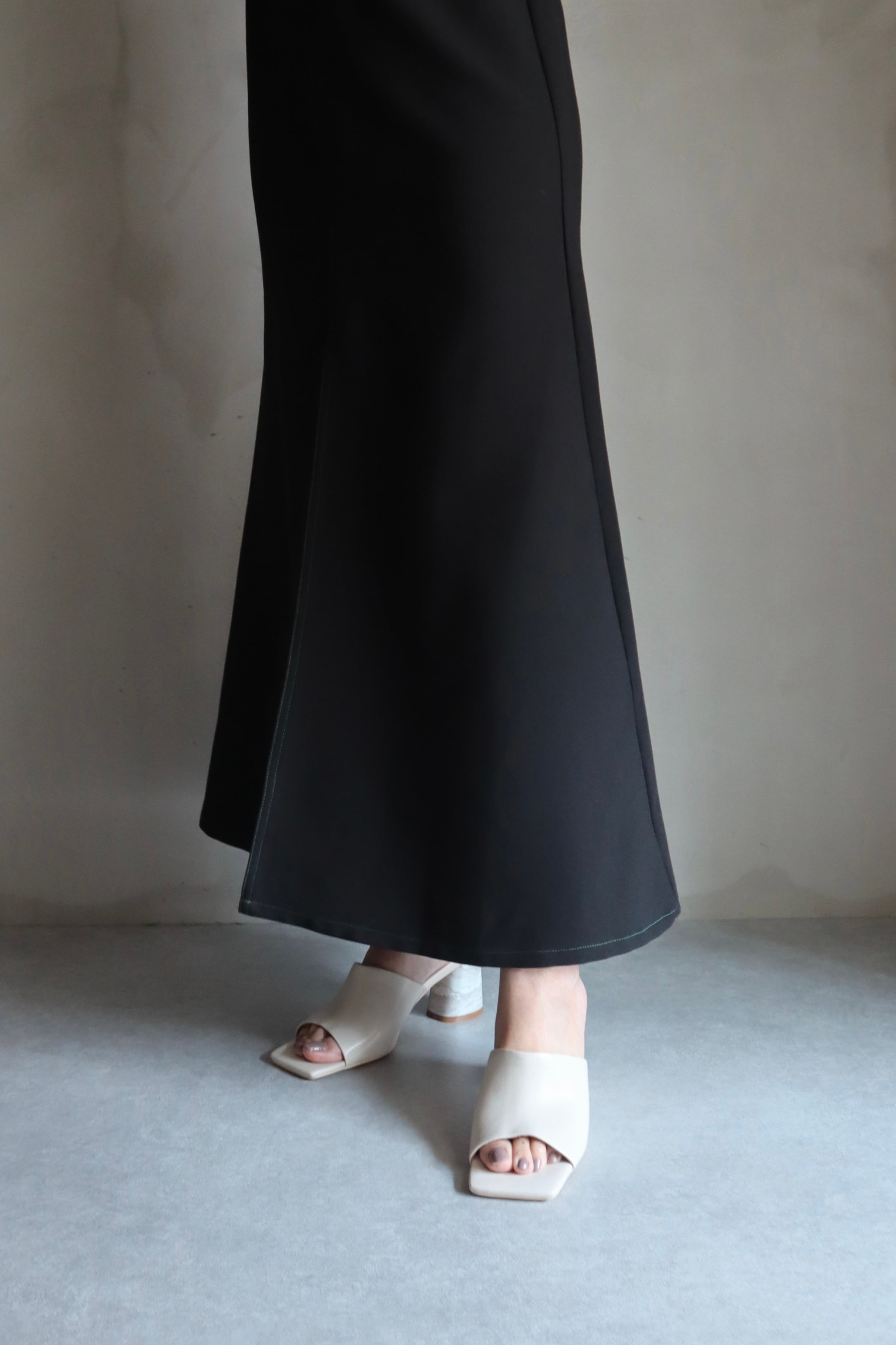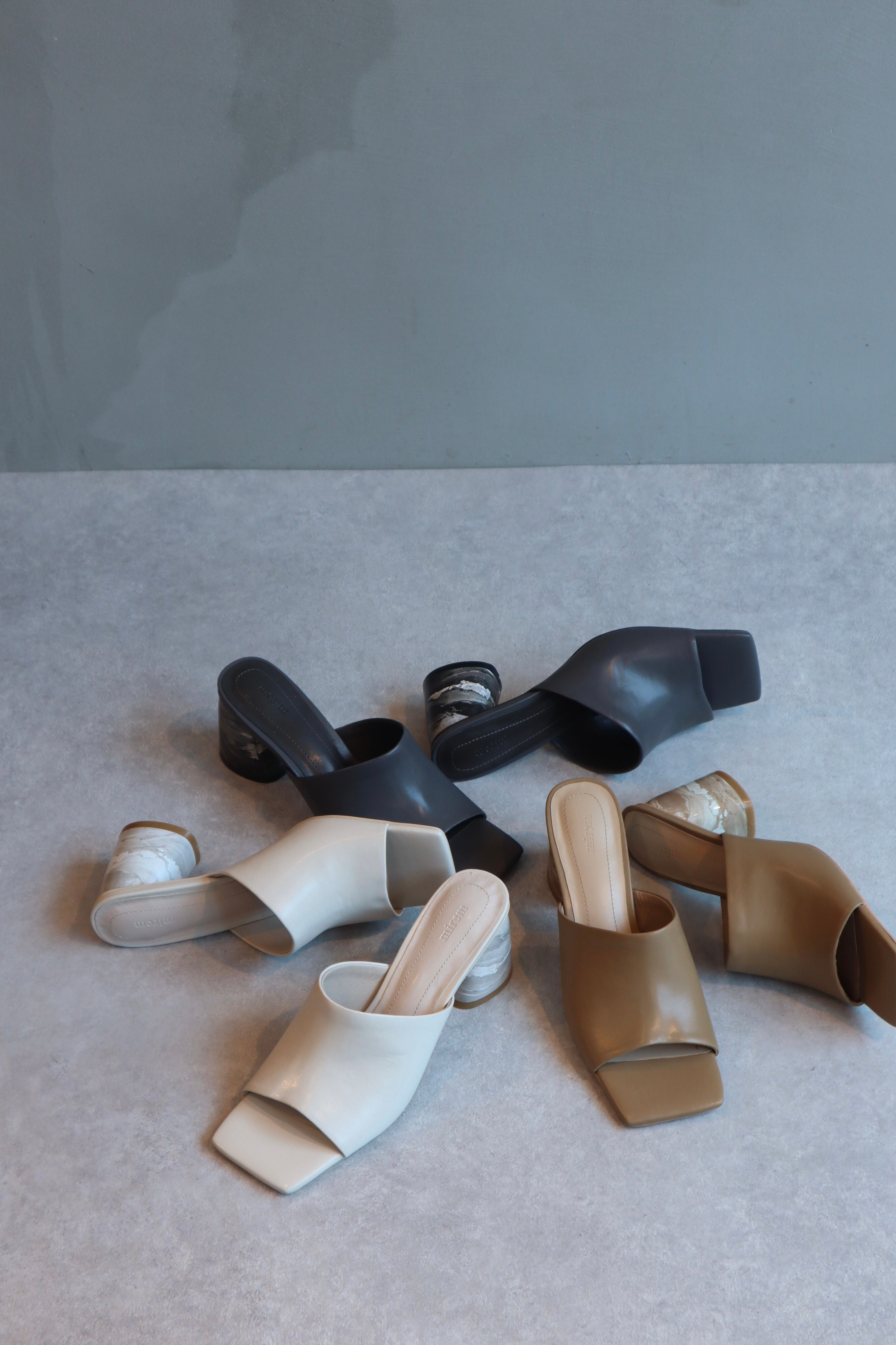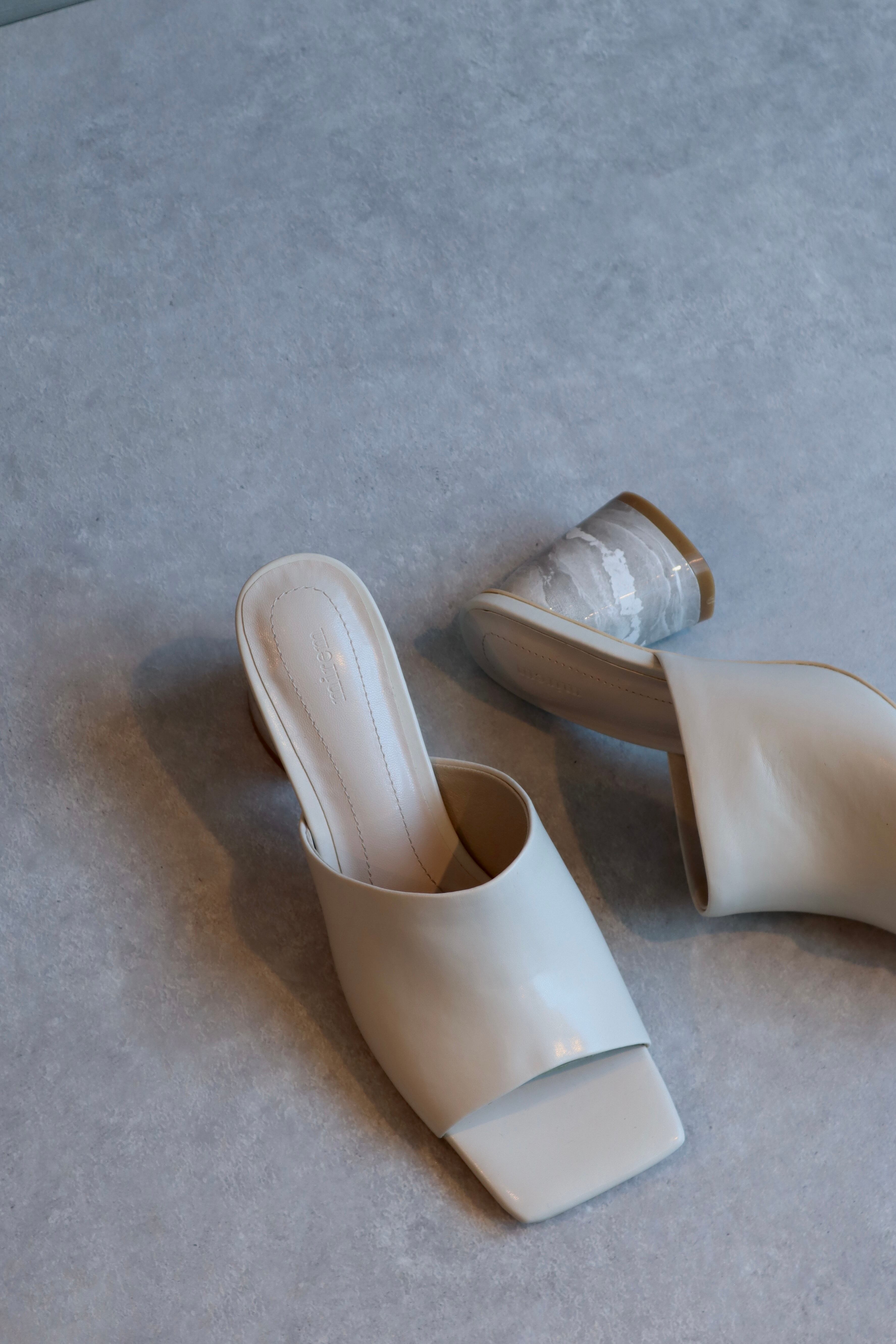 トレンドのスクエアトゥのサンダルにmiremのデザインソースでもある大理石柄をプリントしております。シンプルですが少しモード感もある目を引くデザインになっております。アッパーは深めの設定になっていますので、甲までしっかりと包み込んでくれます。