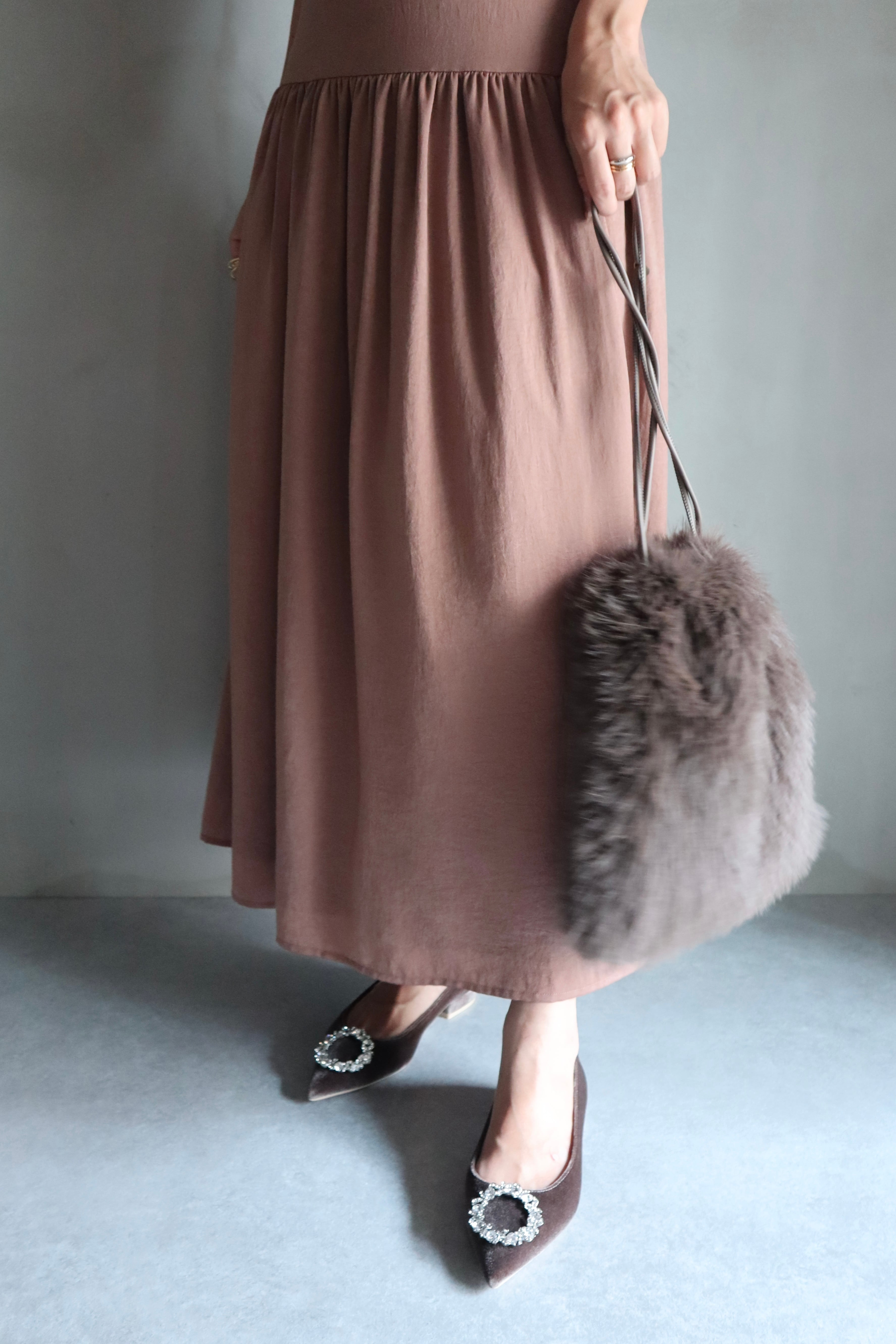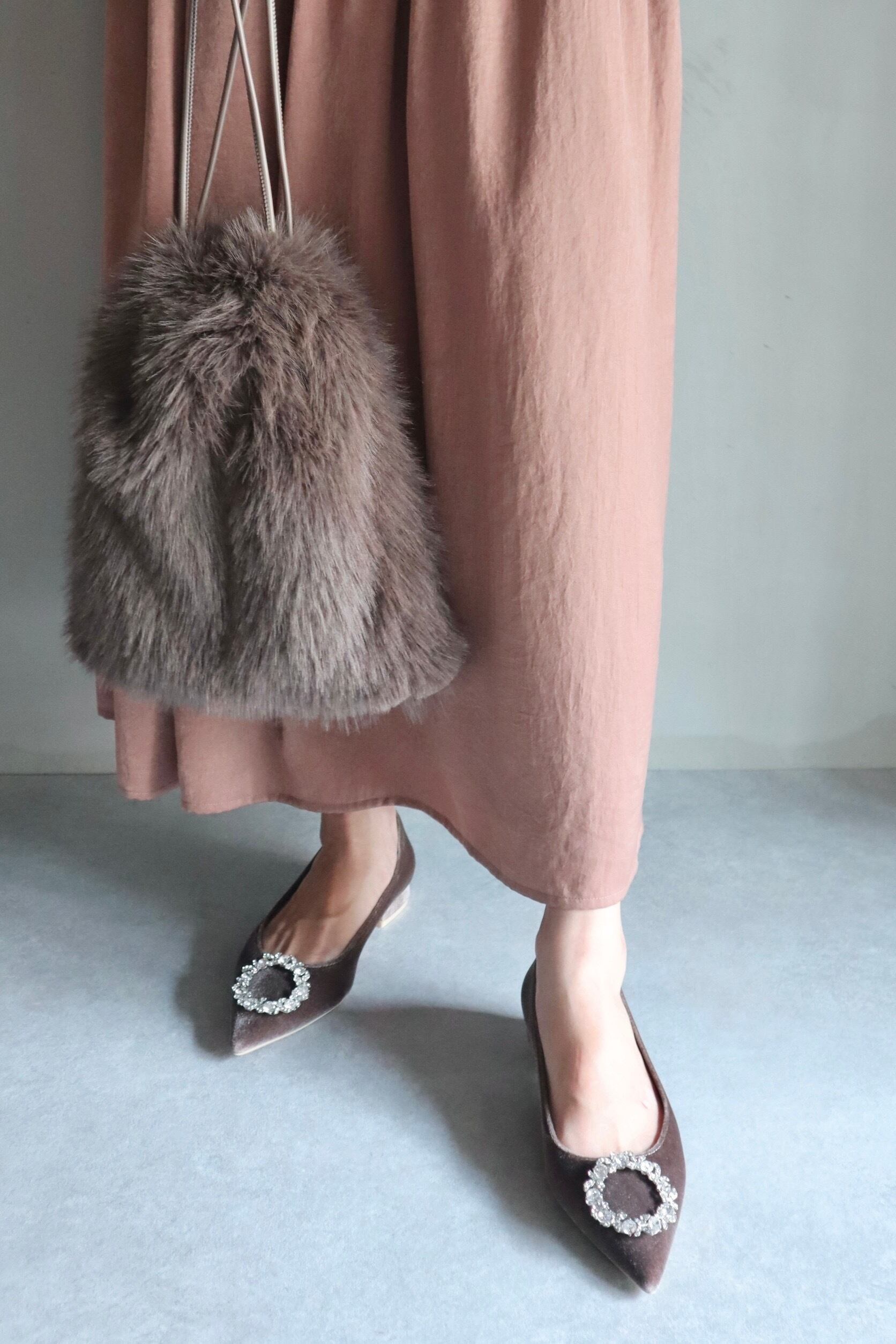 トレンドのベロアスエードを使用した、オリジナルラストのポインテッドトゥです。足が痛くなりやすいポインテッドトゥですが、出来るだけ足に負担がかからないようなラストを採用しています。つま先に付いているビジューパーツは円形のデザインで柔らかい印象を与えます。