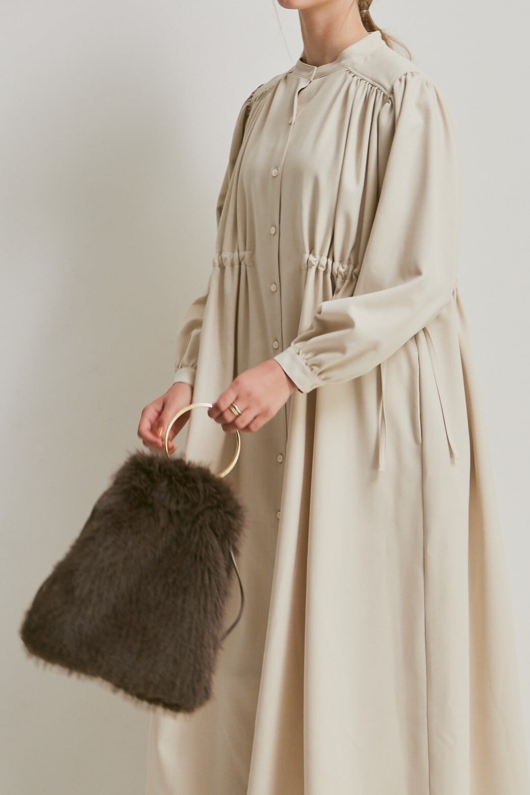 ボリュームのあるエコファーがポイントの巾着バッグ。リングを持って綺麗めに、リングを内側に倒してカジュアルに…コーディネートに合わせて持ち方を変えれるアイテムです。