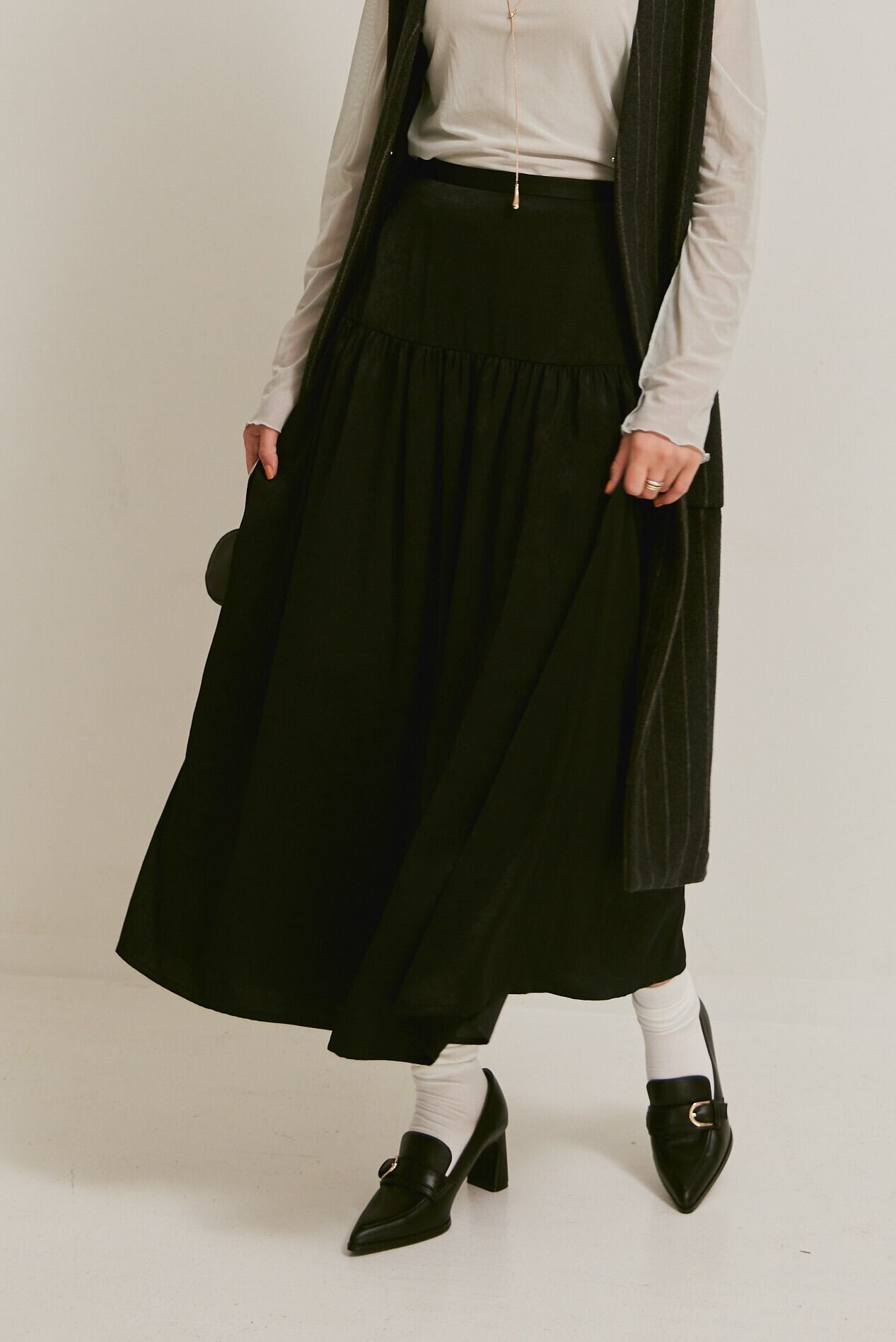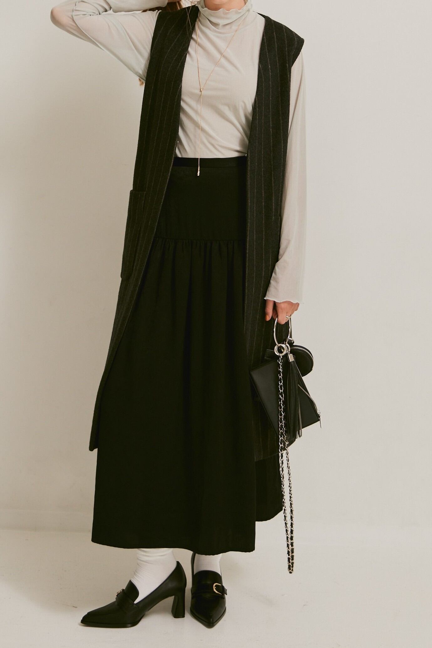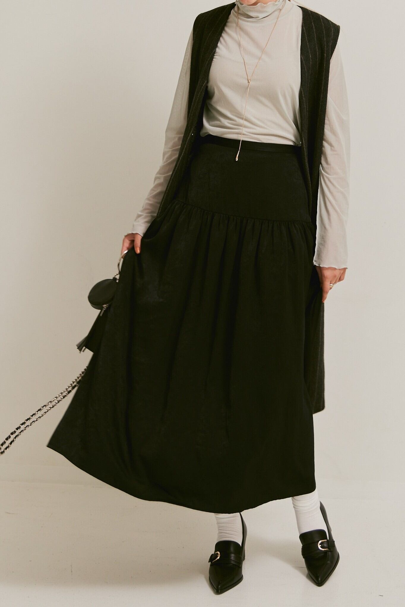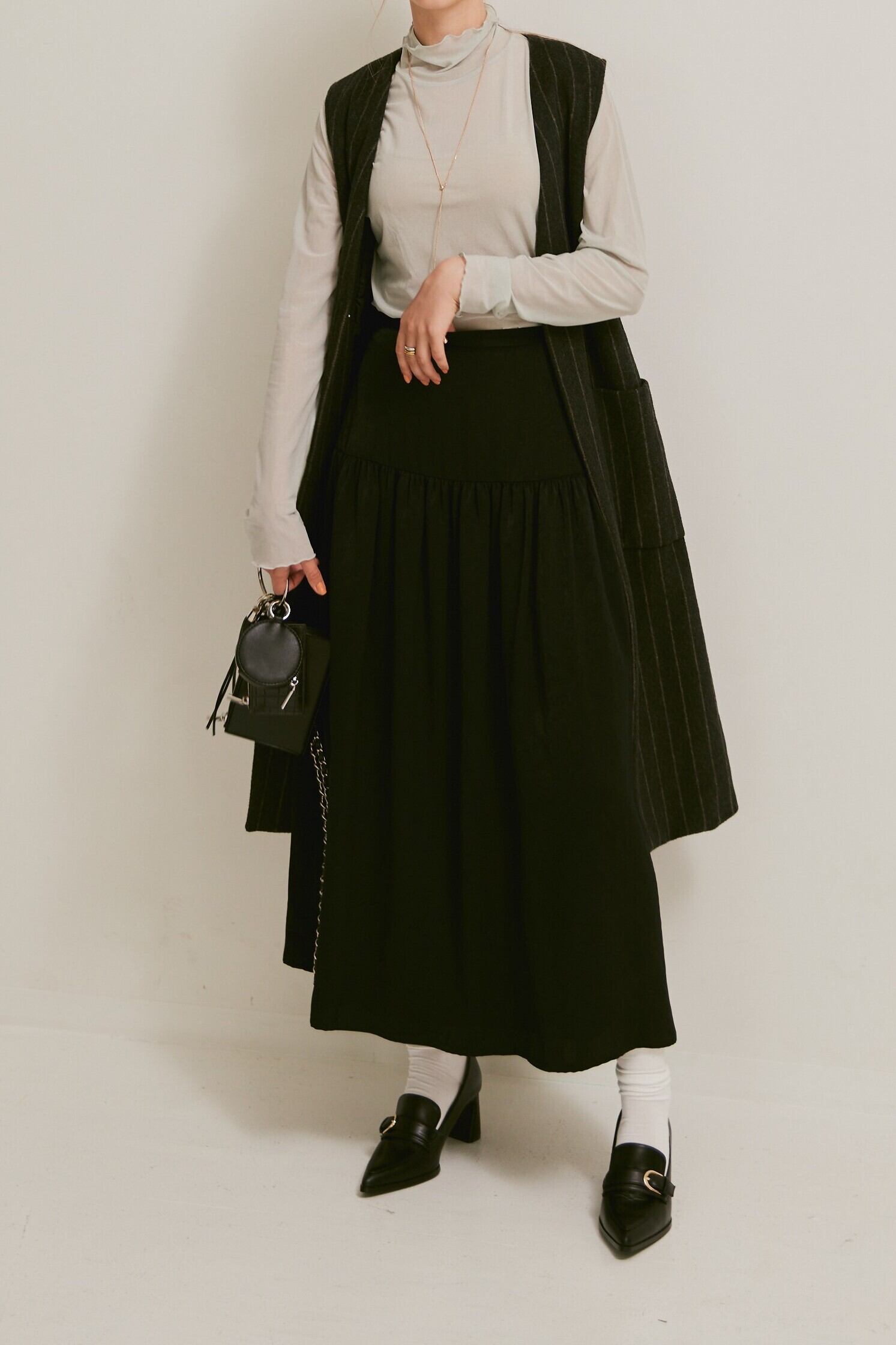 腰回りがすっきりとしたデザインなので、ウエスト部分がきれいに見えます。切り替え部分からふんわりと広がるフィット&フレアスカートです。ヴィンテージサテン生地を使用した、微起毛生地で柔らかく軽いスカートです。