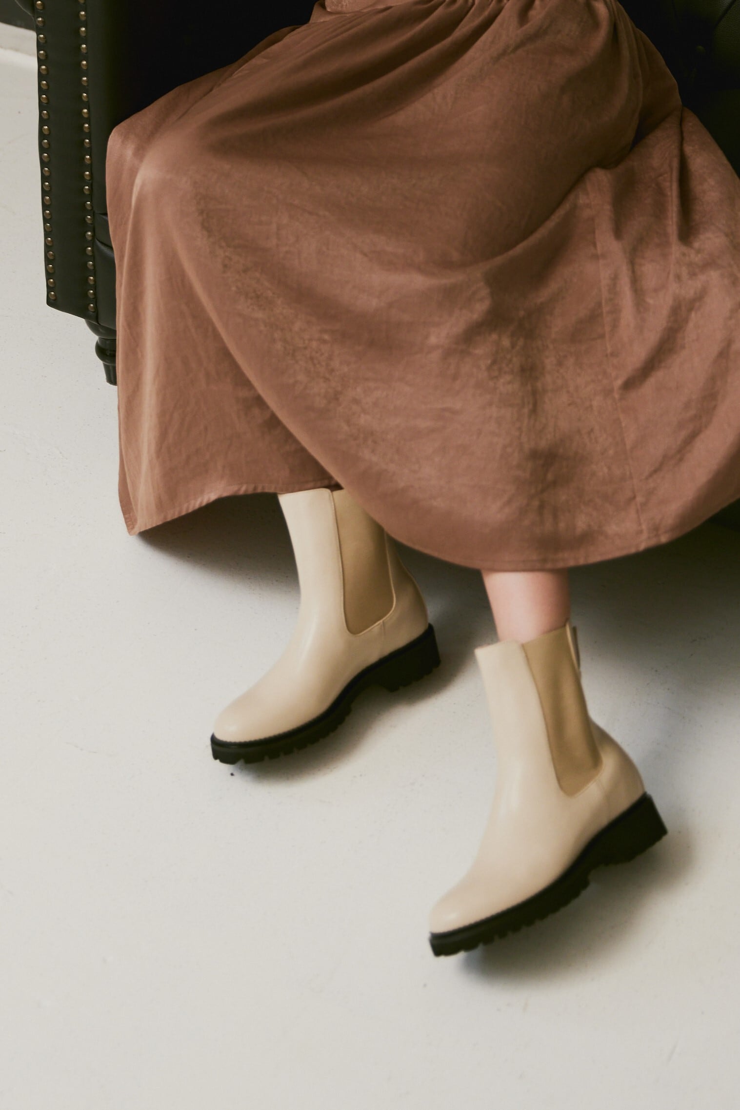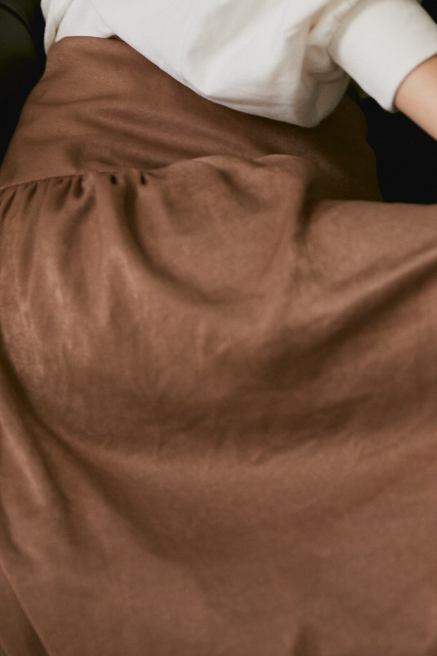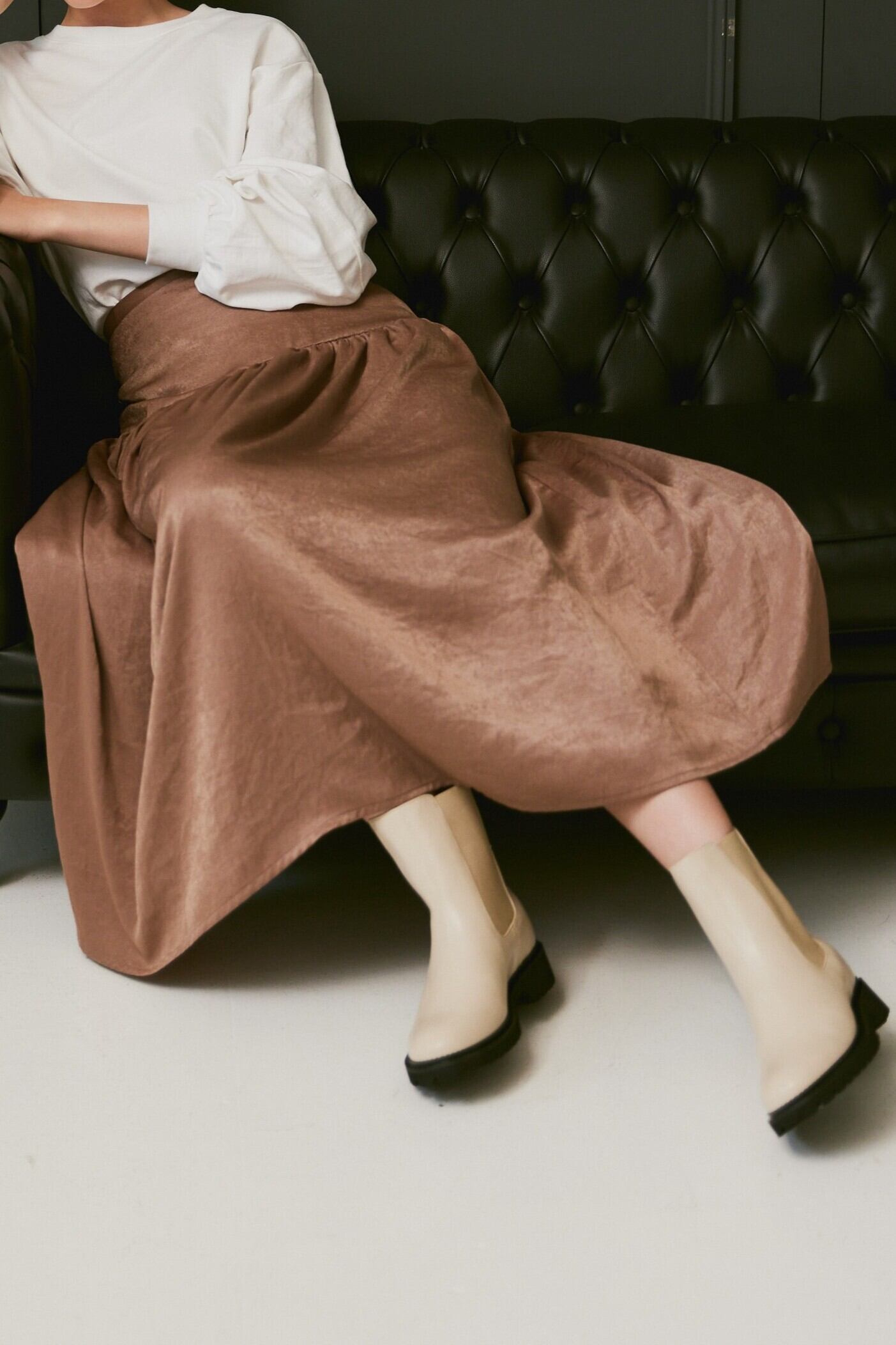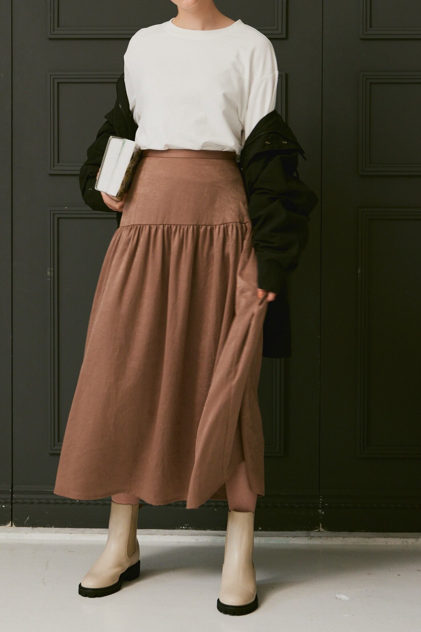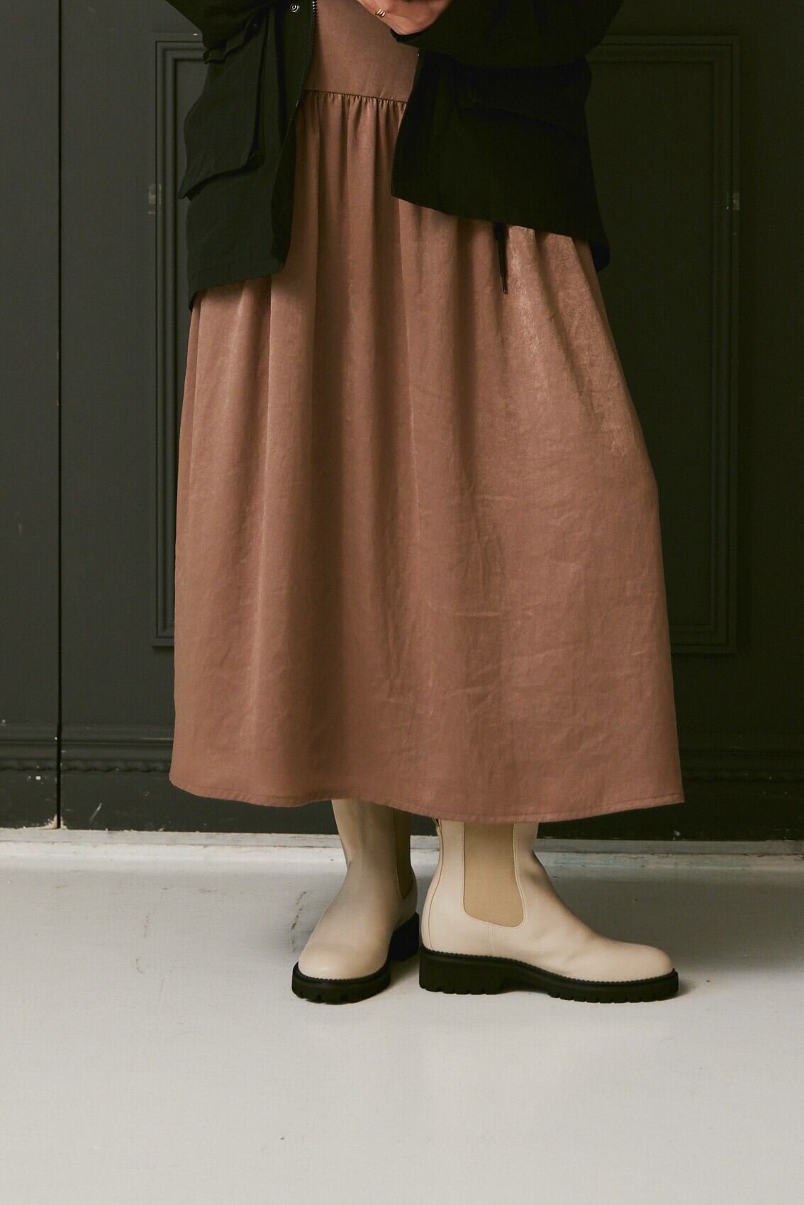 腰回りがすっきりとしたデザインなので、ウエスト部分がきれいに見えます。切り替え部分からふんわりと広がるフィット&フレアスカートです。ヴィンテージサテン生地を使用した、微起毛生地で柔らかく軽いスカートです。