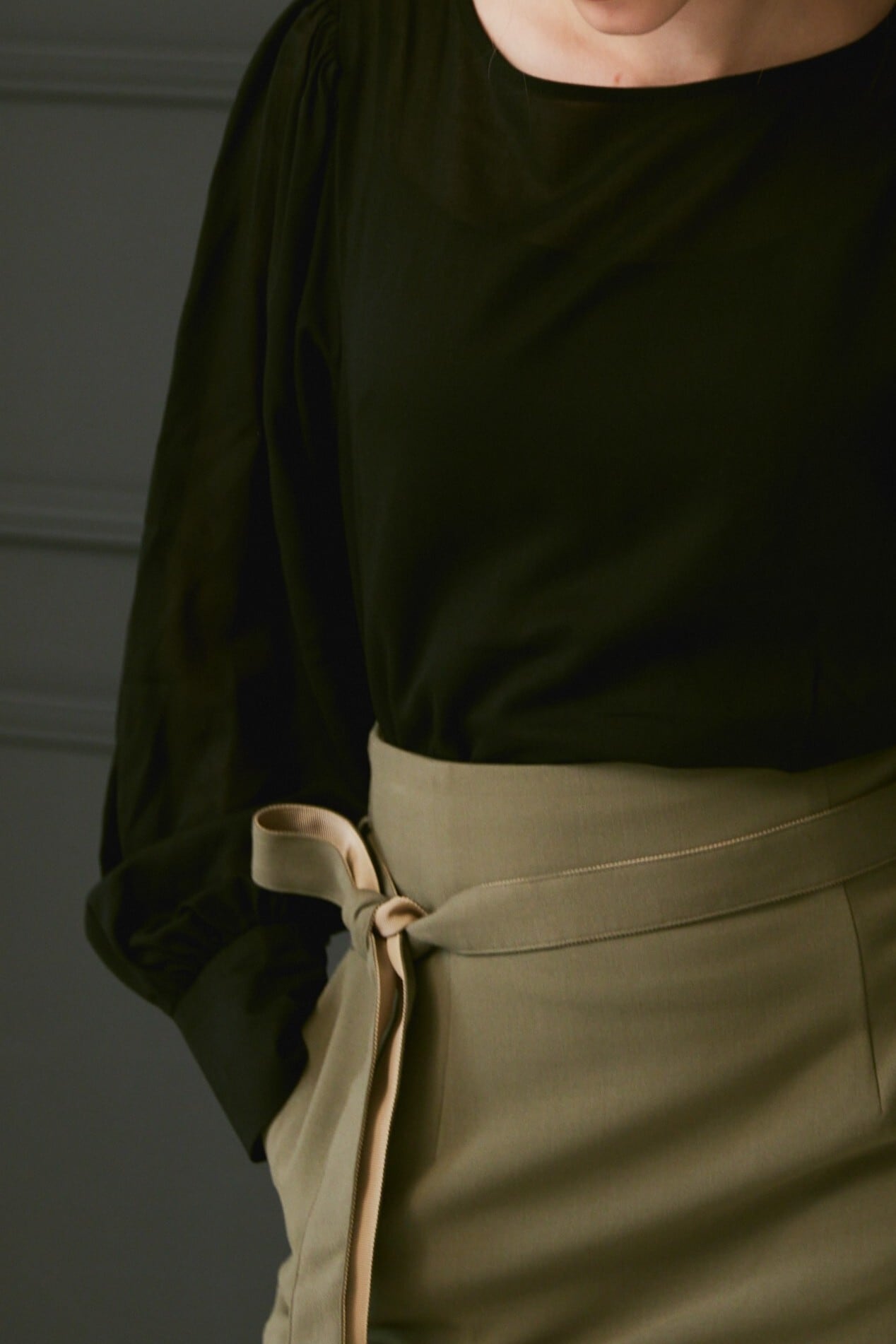 透け過ぎず、程よい抜け感を演出してくれるブラウスです。袖はとろんとした袖落ちを感じるゆったりとしたドルマンスリーブです。シアー感のある、ナチュラルな表情の生地は触り心地も良く、上品さとリラックス感を演出してくれます。植物由来の繊維を使用しているサスティナブル素材を使用しております。