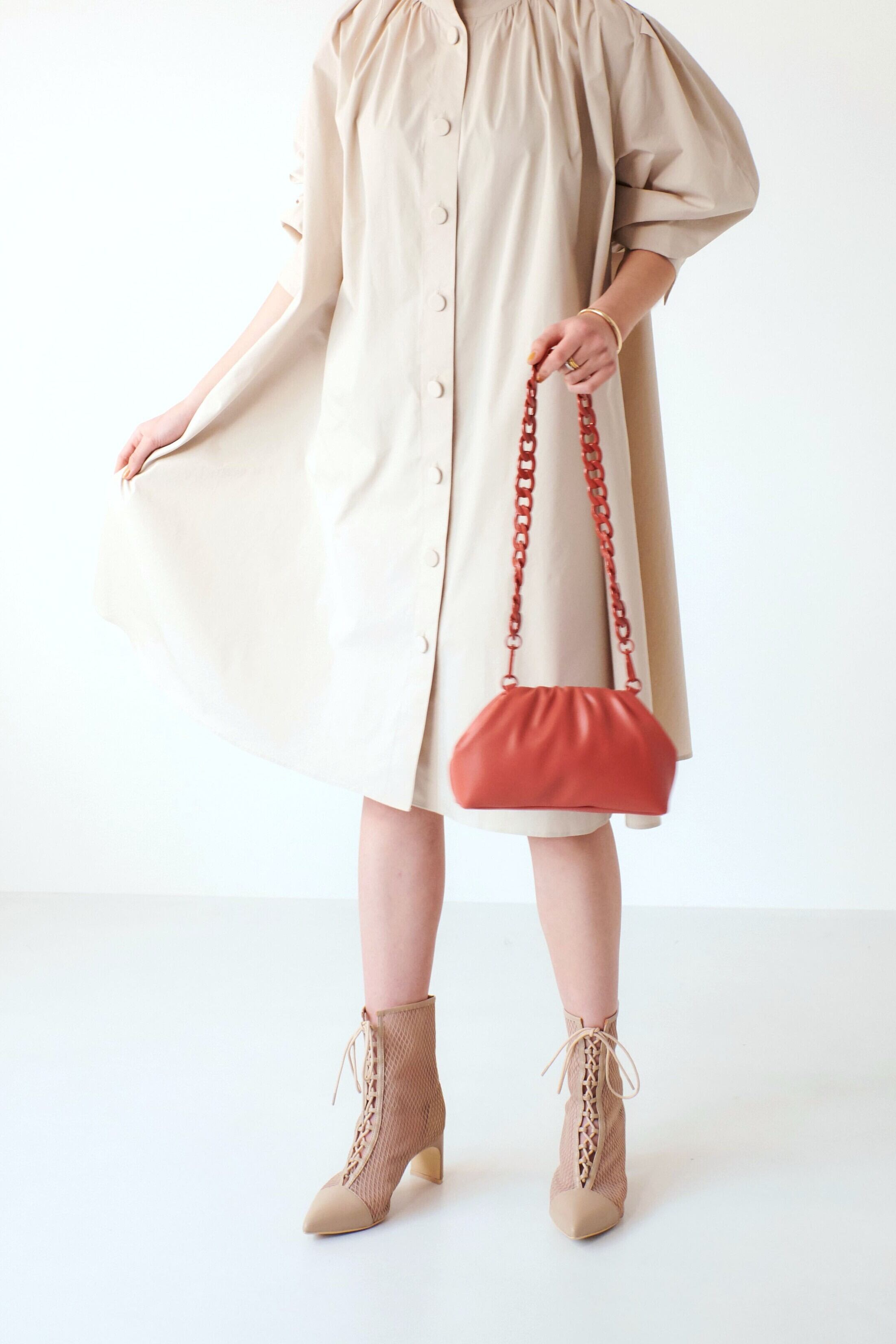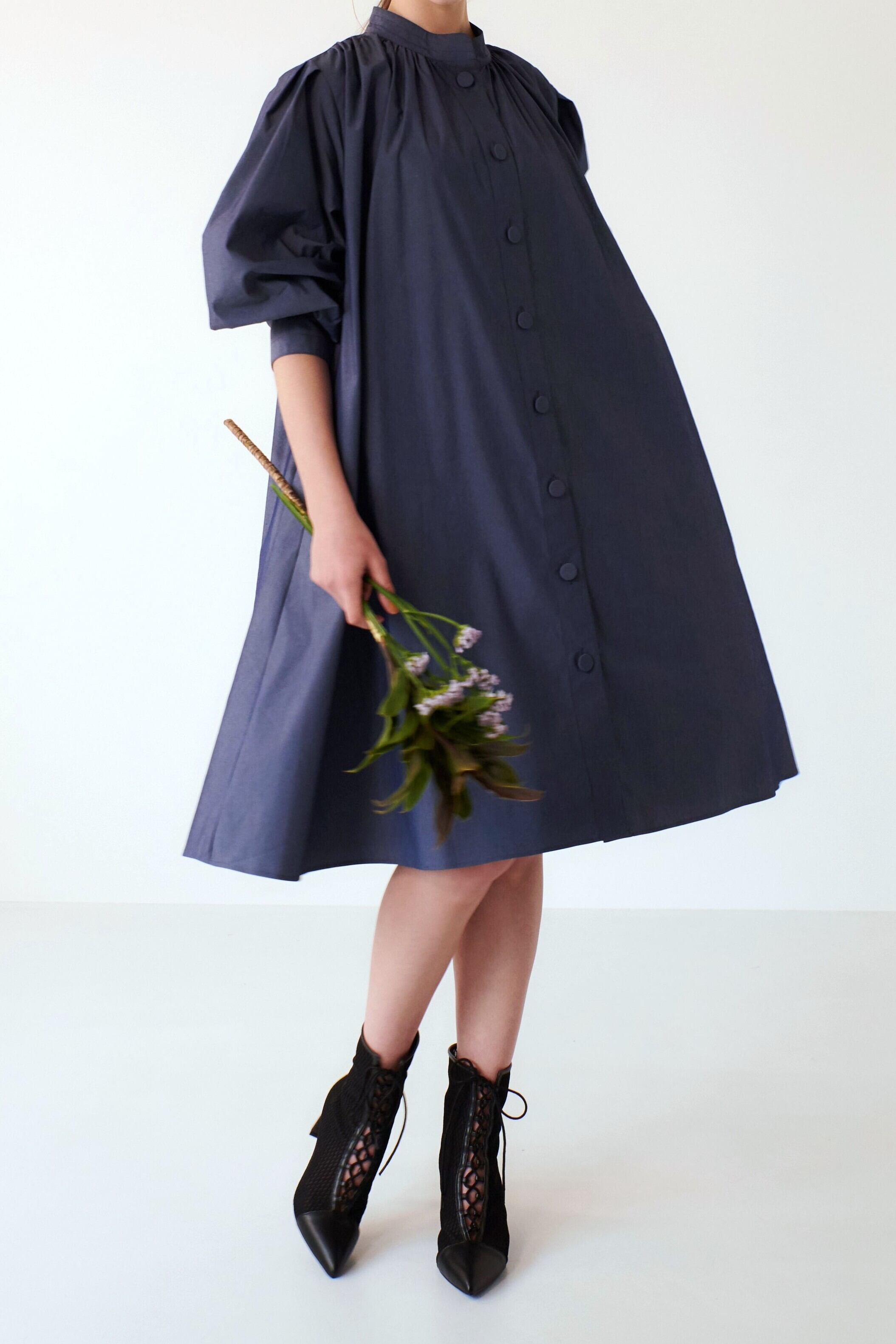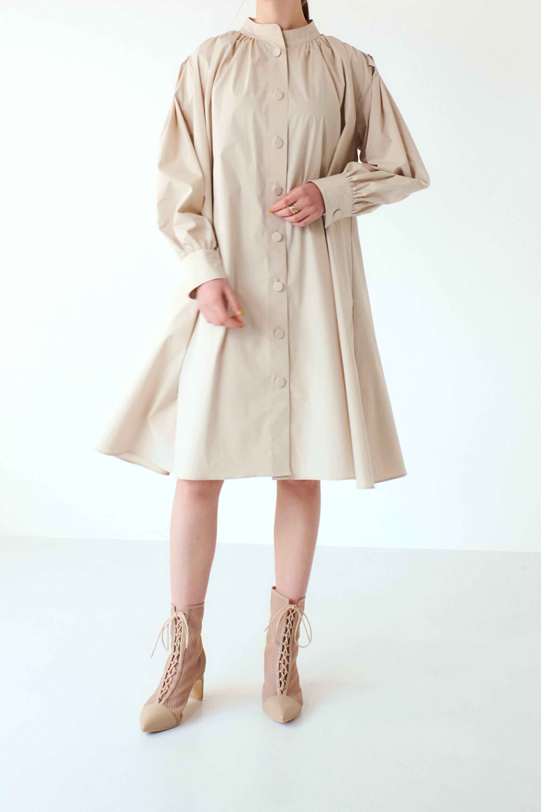 少し光沢のある生地でフレアたっぷりのシャツワンピースです。1枚でももちろん、パンツ合わせでも合う丈でお作りしております。お袖部分内側のボタンで長さ調整や袖のボリューム感を出す事が出来ます。