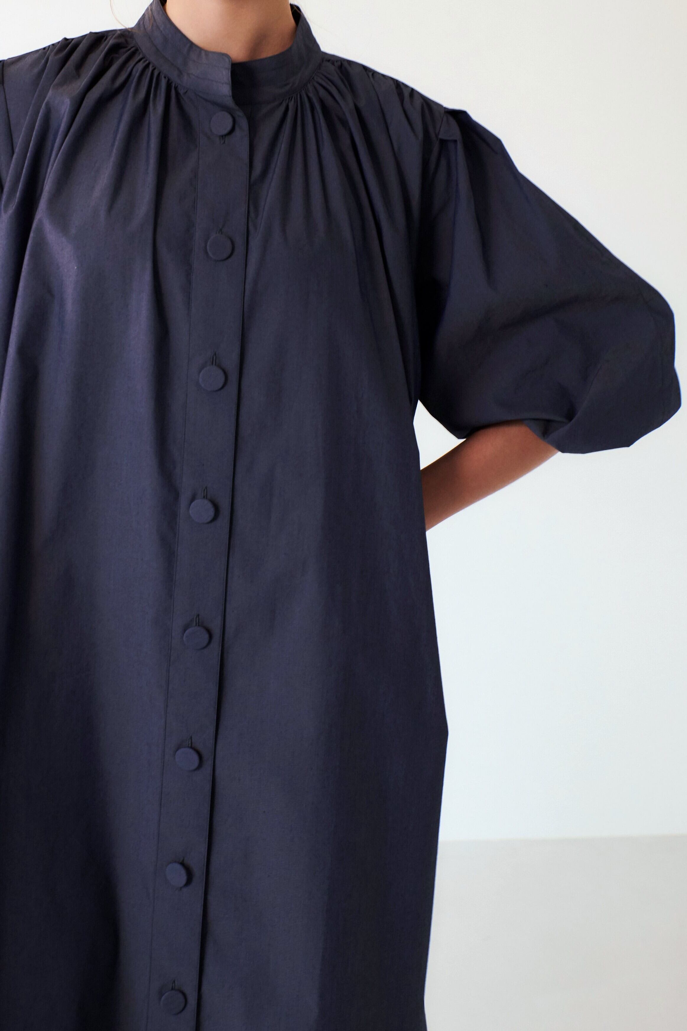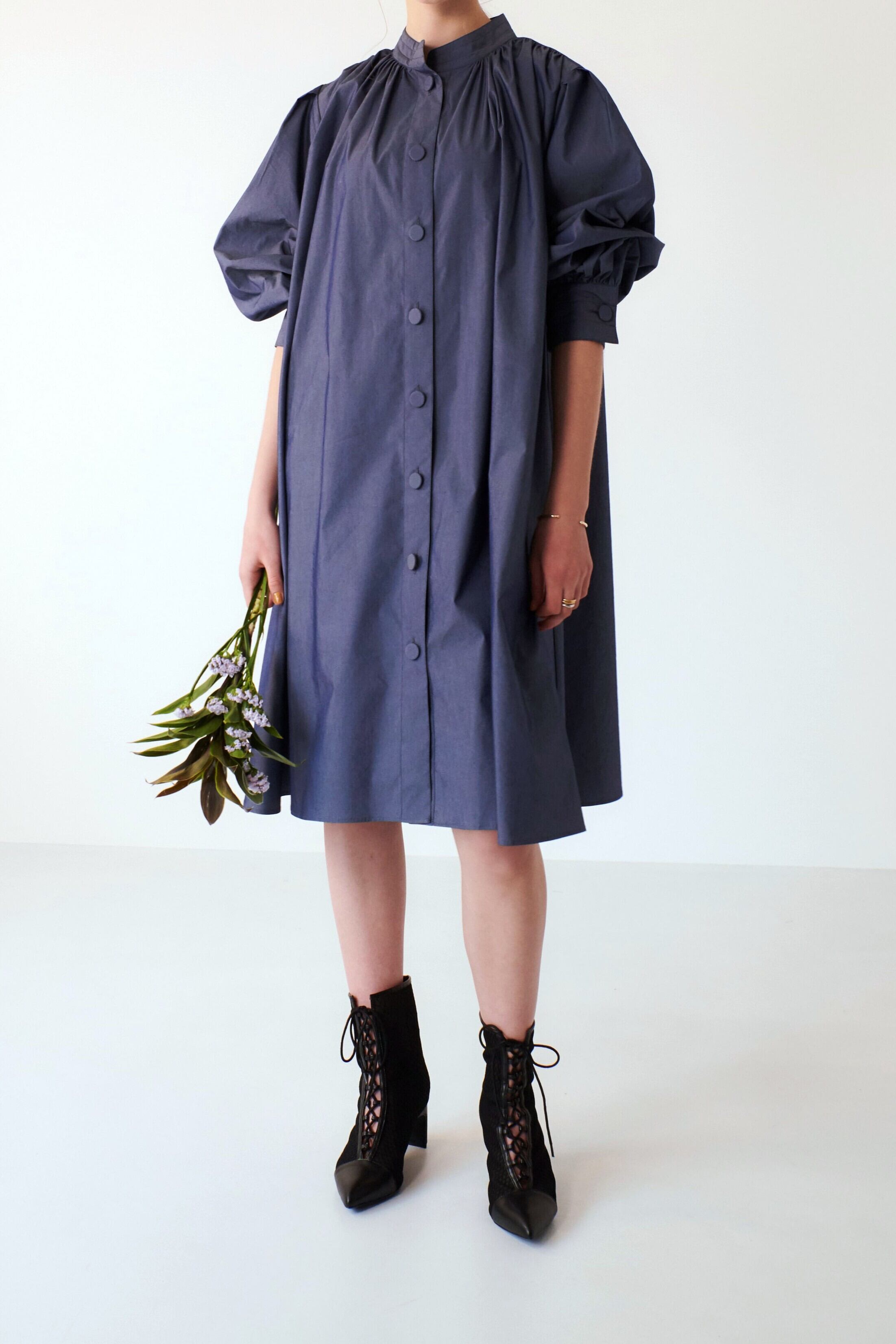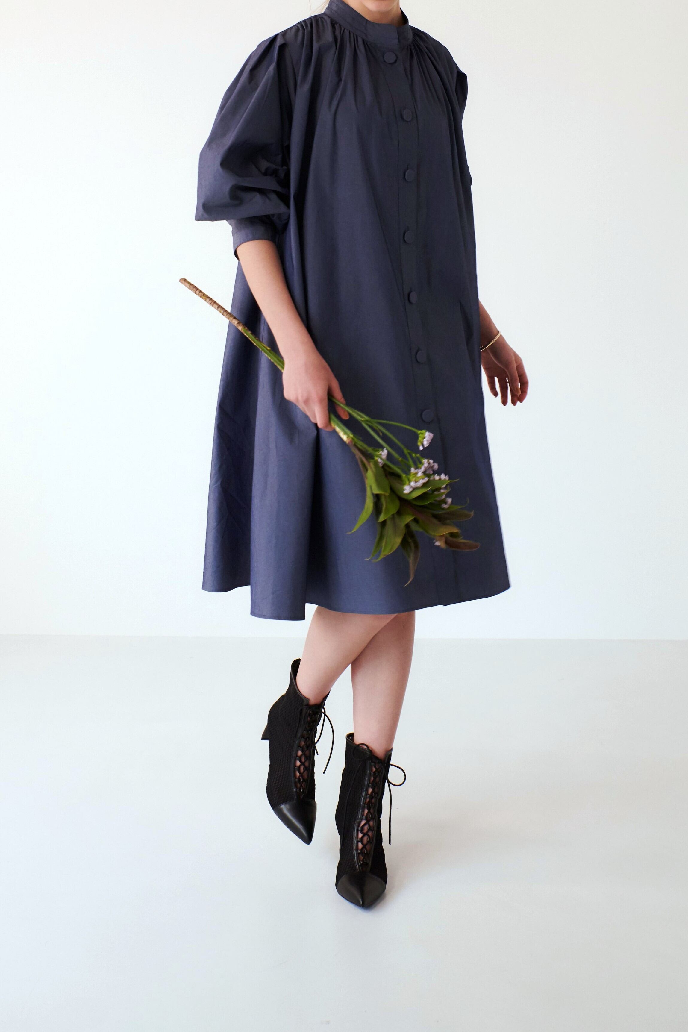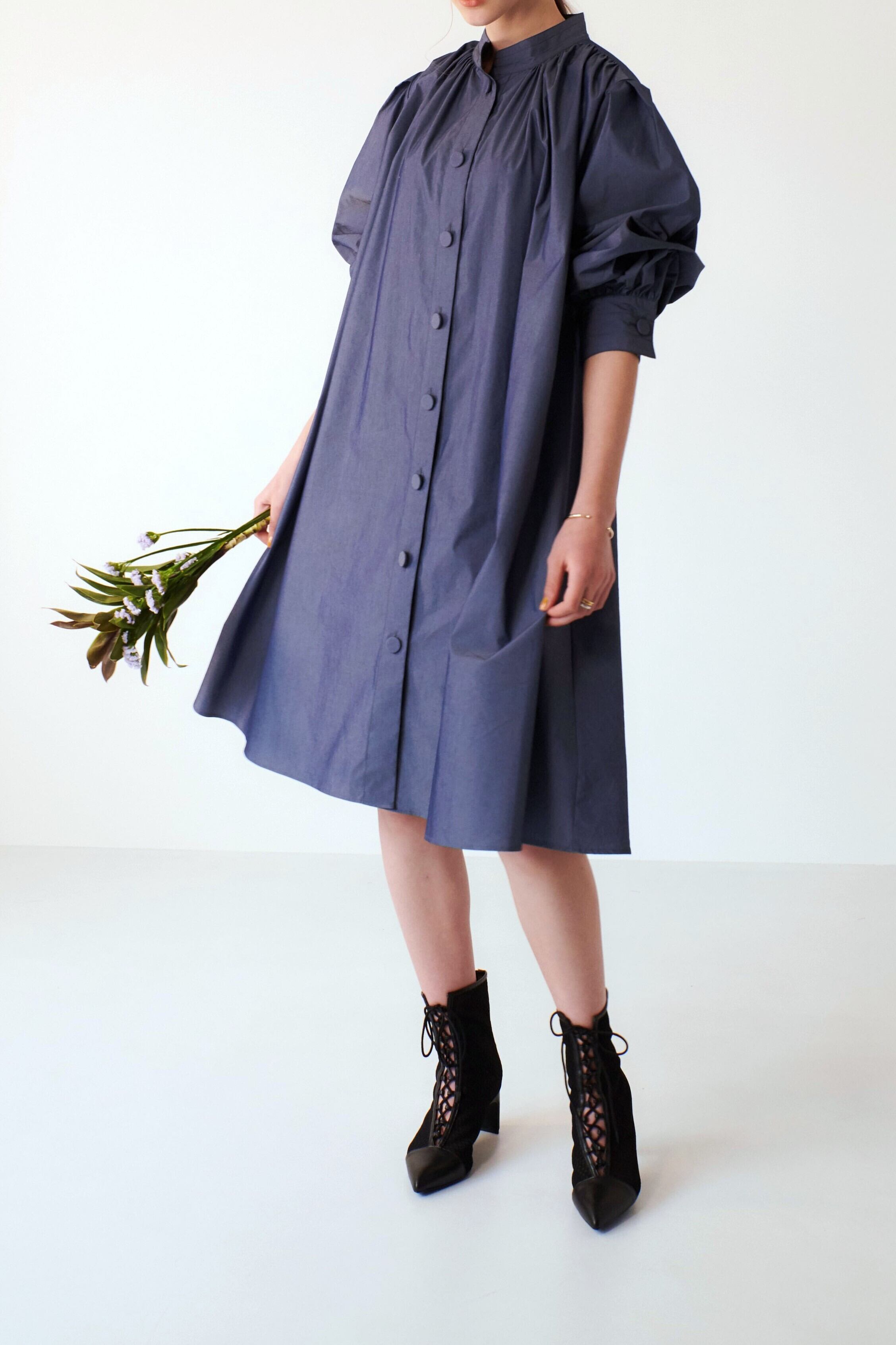 少し光沢のある生地でフレアたっぷりのシャツワンピースです。1枚でももちろん、パンツ合わせでも合う丈でお作りしております。お袖部分内側のボタンで長さ調整や袖のボリューム感を出す事が出来ます。