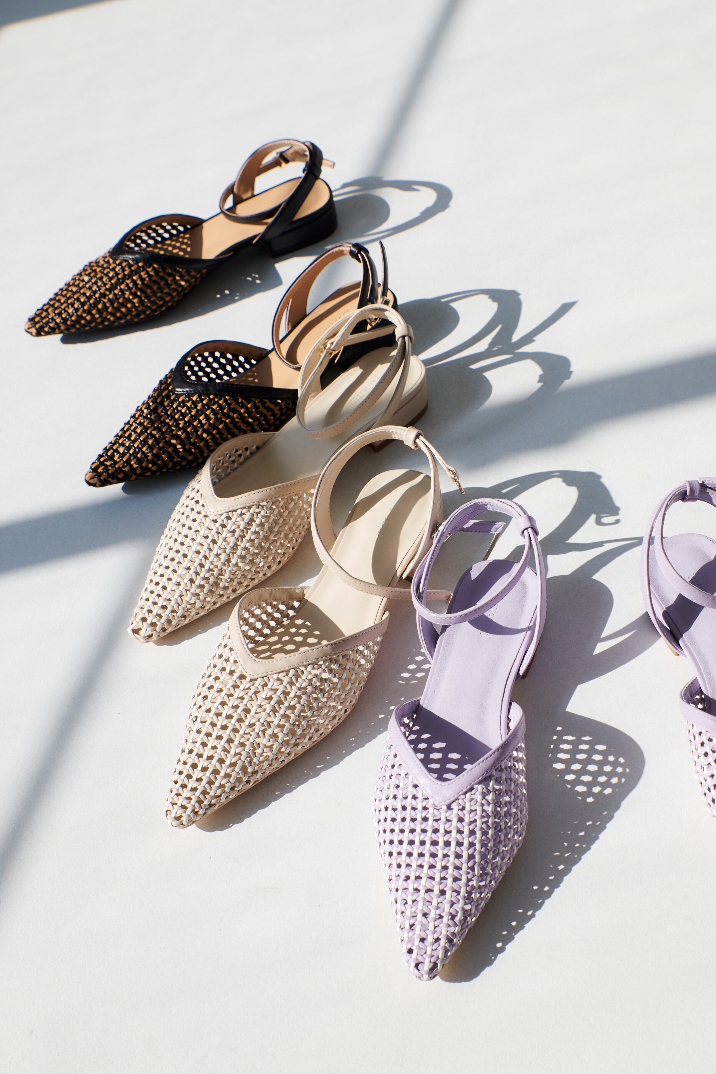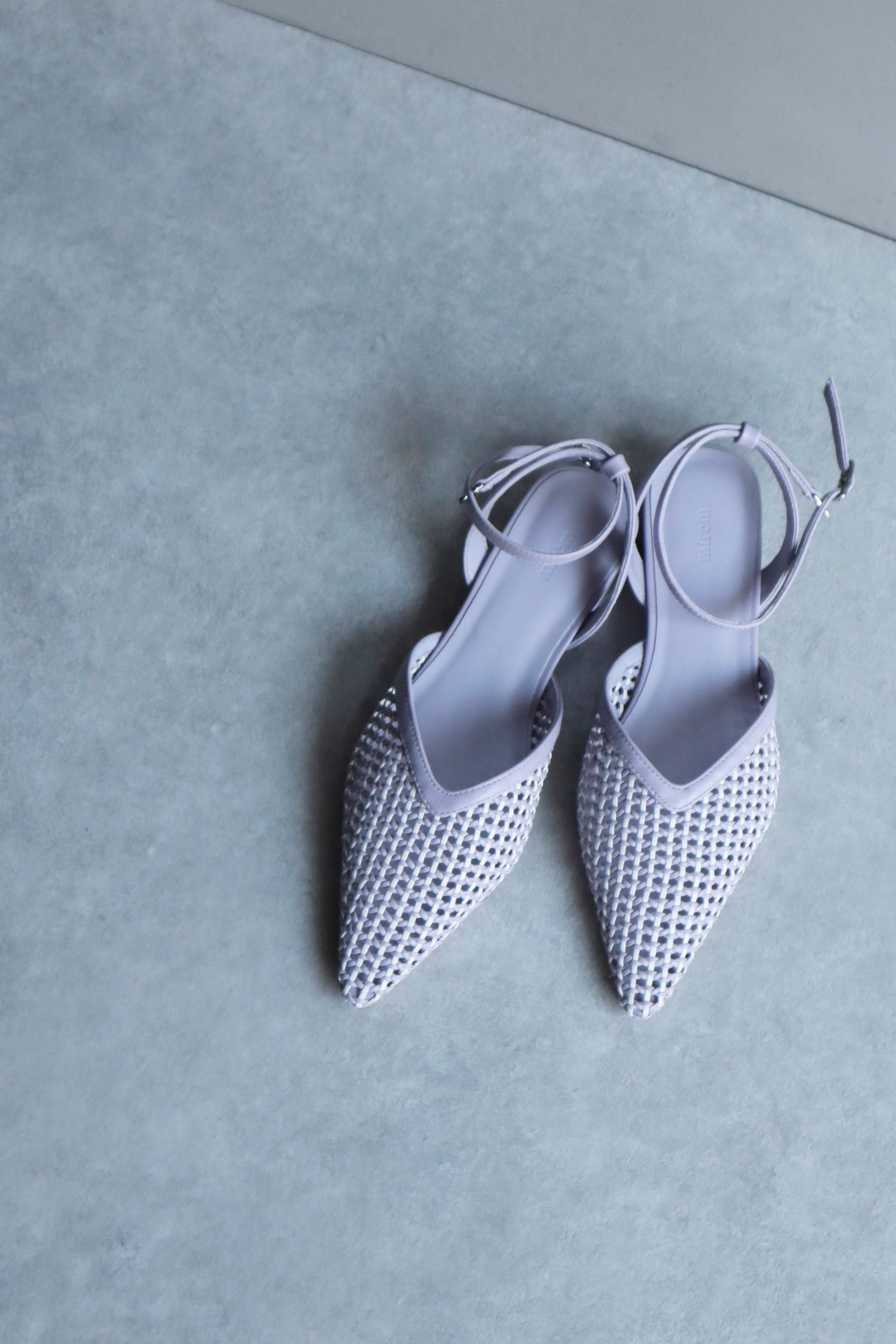 エコレザーを使用し、職人さんが手作業で編みこんだオリジナルカラー配色のメッシュパンプスです。メッシュ部分は柔らかく仕上げているので、足になじみやすく包み込んでくれます。甲部分のVカットデザインは足元を綺麗に魅せる効果もあり、パンツスタイルでも、スカートスタイルでも合わせやすいシューズです。春先~秋口まで長く履ける1足です。