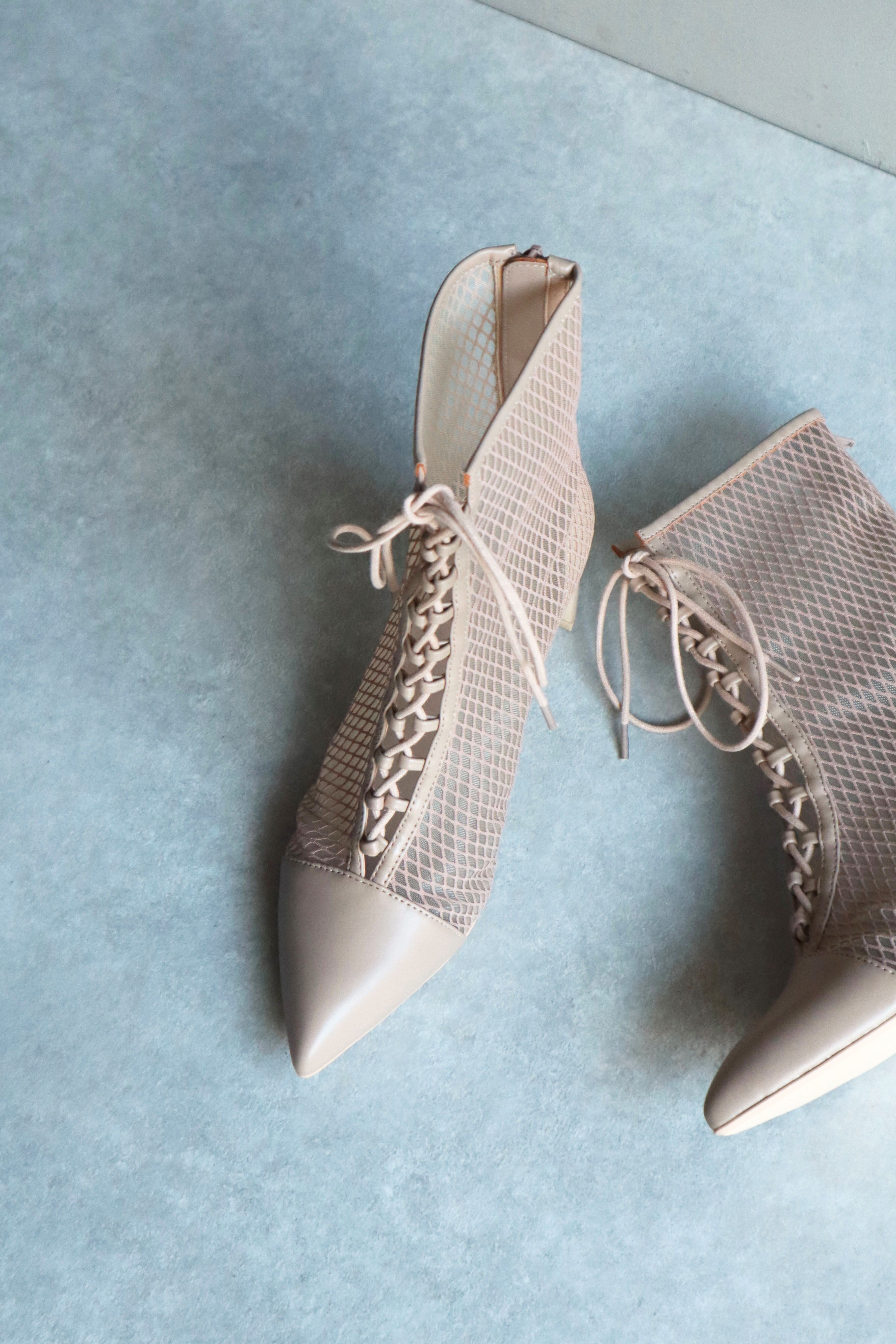 メッシュチュール素材を使用した、程よい透け感のあるメッシュブーツです。レースアップはお好みの幅で調整可能ですので、肌見せ.も調整でき、履くと一気にエレガンスモードな印象になります。特にワンピーススタイルに合わせやすく、コーディネートのアクセントとなる1足です。 春を先取りできるメッシュブーツは肌なじみの良いBEIGEカラーとクールな印象になるBLACKの2色展開です。