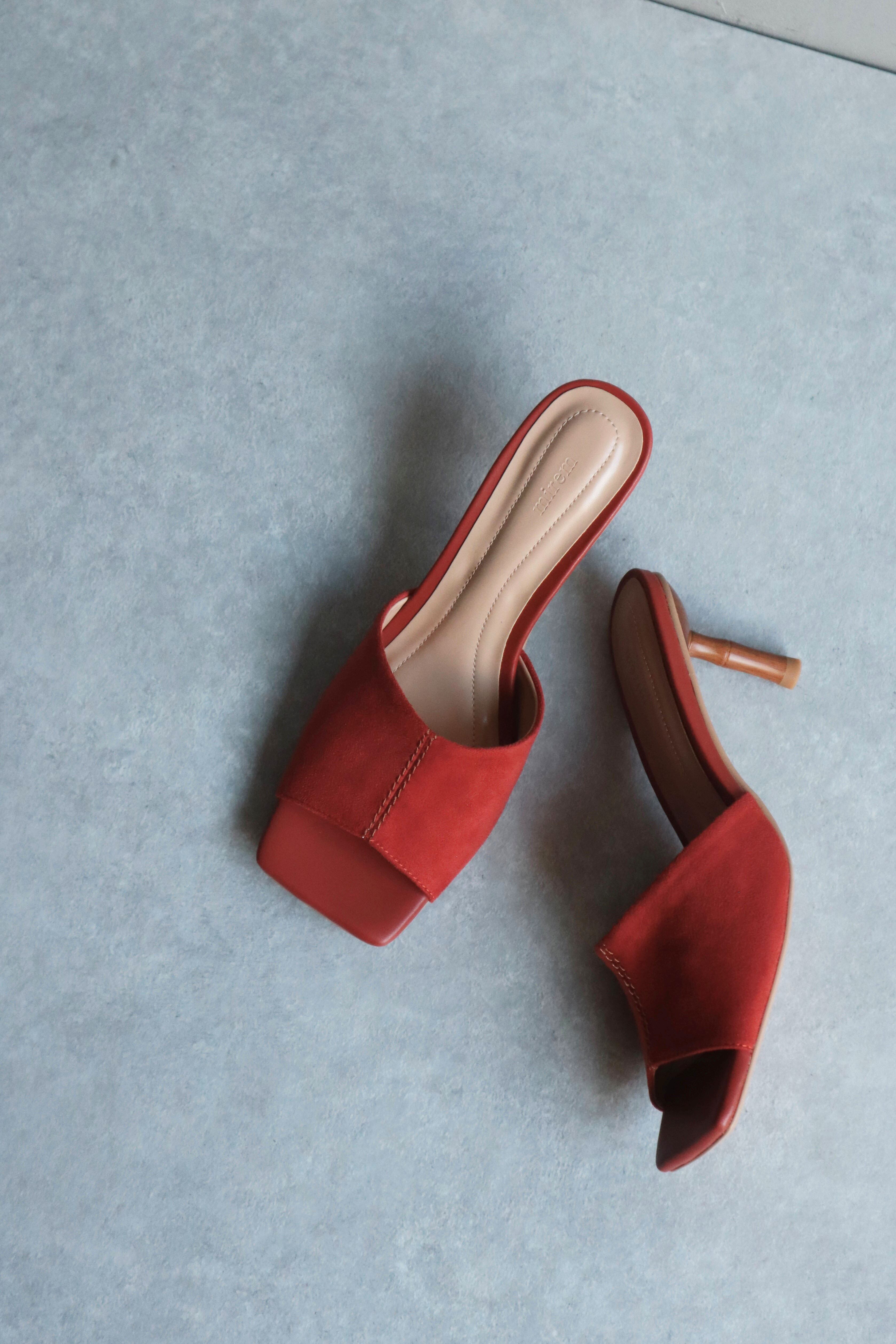 バンブー調ヒールは、職人さんが手作業で1つ1つ塗装した、2重塗装がポイントです。存在感のある甲部分の縦ラインのステッチが足を綺麗に魅せてくれます。スエード調とデニム素材の2種類あり、どちらもコーディネートのポイントになる配色で仕上げています。中敷きにはぷっくりとしたクッションが入っているので足への負担を和らげてくれます。