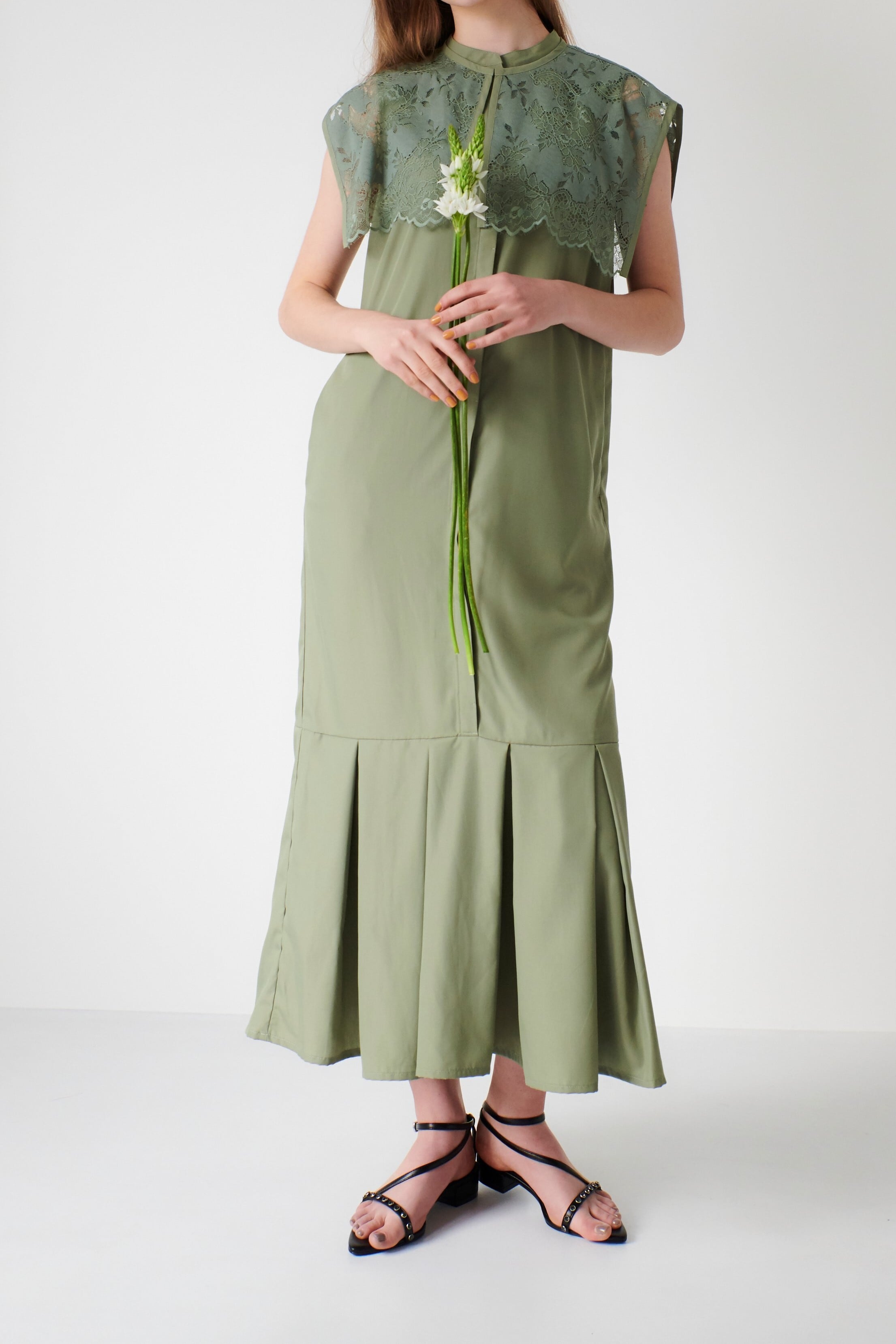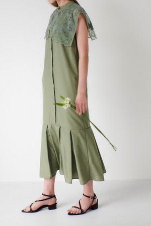 レース生地に特徴のある襟をつけたロングワンピースです。使用しているレースは特殊なジャガード機を使って織られており、レースは通常は全体を透けさせることしかできないところ、部分的に透けたり透けなかったり凹凸感を表現した特殊なレースです。襟は取り外し可能になっており、ワンピース1枚でも着れる様になっております。裾はタックで切り替えられており、歩くとふんわり広がる様になっております。ワンピース3色共にイージーケアが可能でご自宅でのお洗濯可能です。(レース襟は繊細な生地を使用しているため、クリーニングを推奨しております。