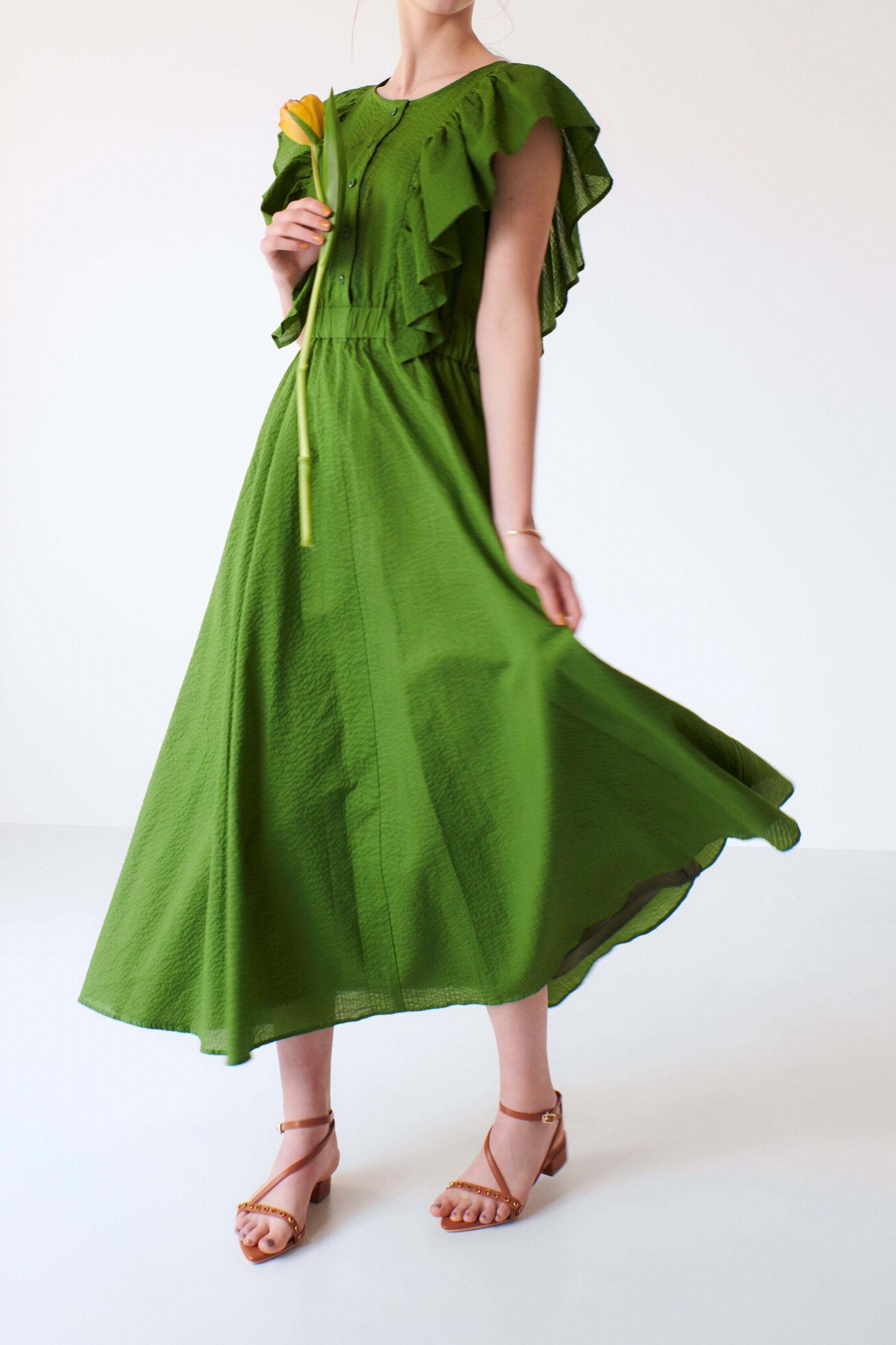 細かいポコポコ感のあるサッカー生地を使用した柔らかい生地のワンピースです。薄手の生地なので暑い夏でも涼しげに着て頂けます。肩からウエストにかけて入ったフリルは大きめに作られているので、気になりやすい二の腕もスッキリ見せてくれます。ウエストも高めに設定していますので、全体のバランスを綺麗に見せてくれます。