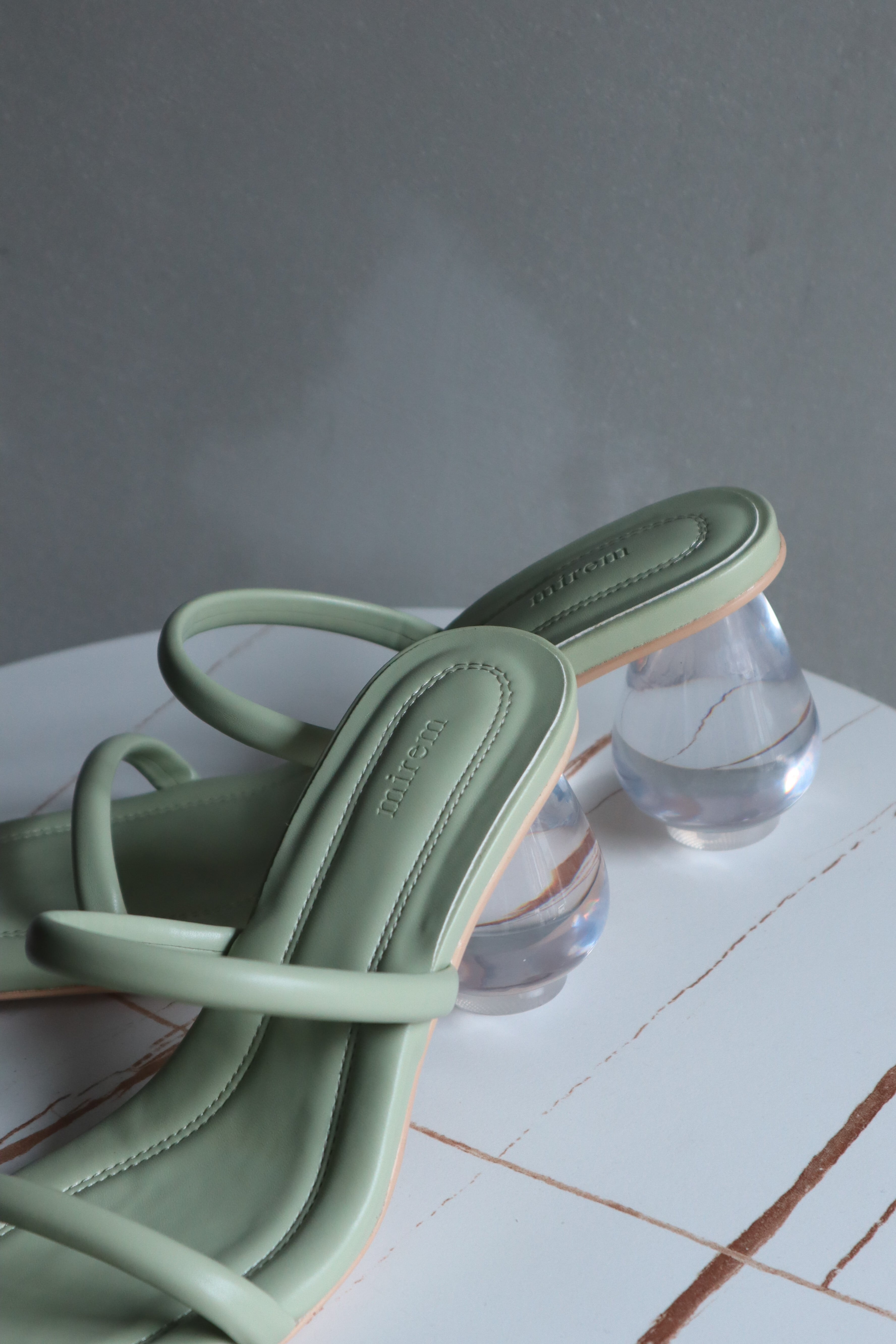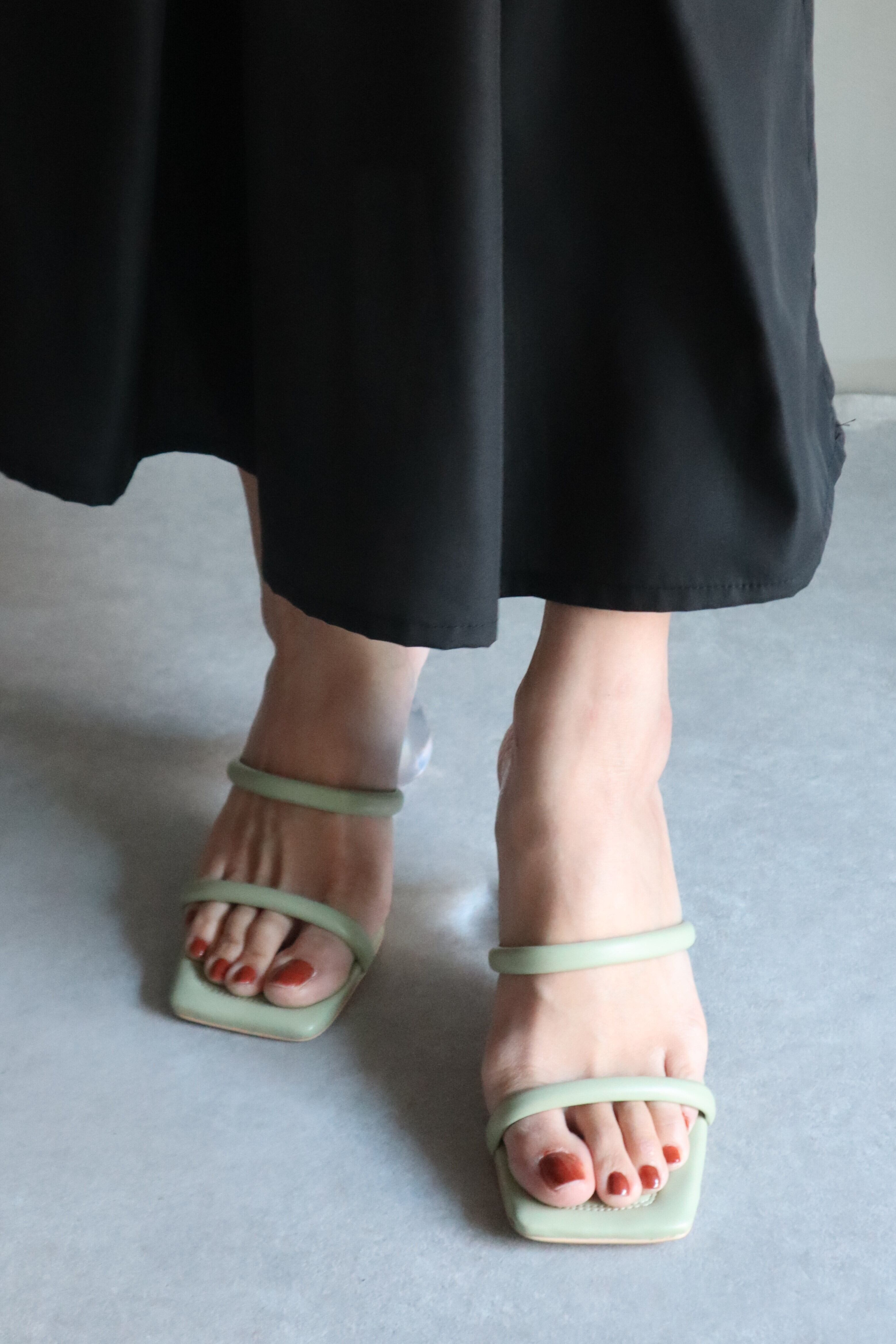 夏に履きたくなるクリアヒールサンダルはヒールが涙型になっており、特徴的な形のヒールを使用しております。ヒールに光が当たると屈折してとてもきれいに見えます。中底全体にクッションを敷いていますので、疲れづらく、程よいクッション感を感じることができます。華奢に見える細ベルトデザインのアッパーですが、甲部分はしっかりホールドして、歩きやすいようになっております。